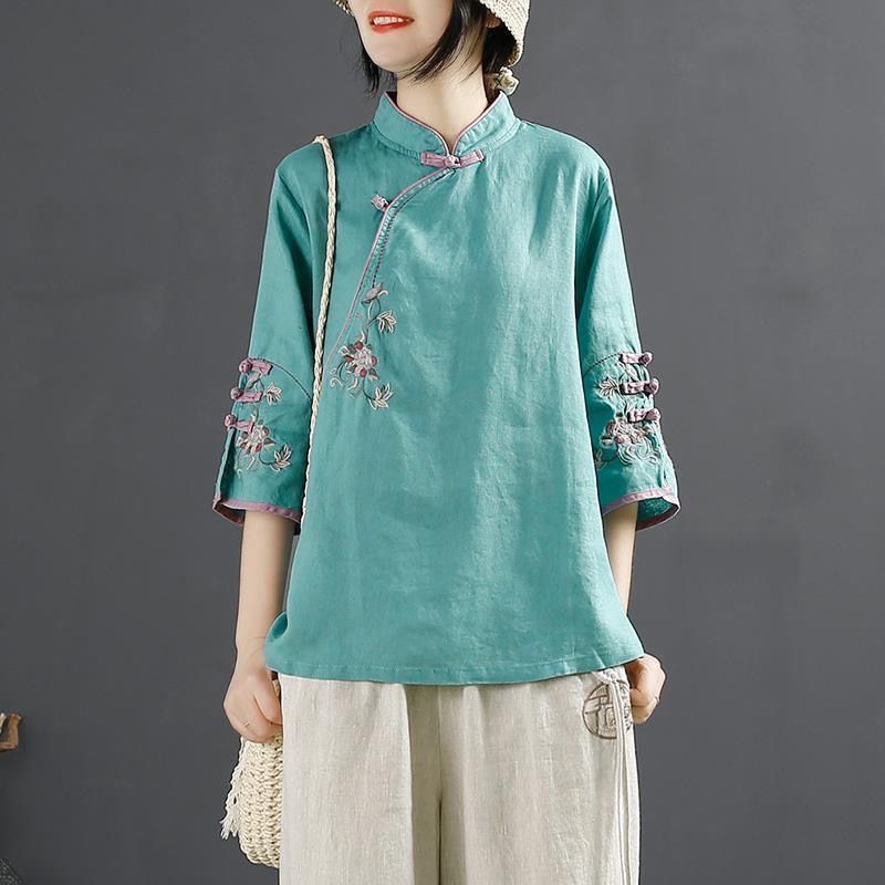 【特惠買一送一!氣質超群!】春夏斜襟繡花復古棉麻立領盤扣襯衫