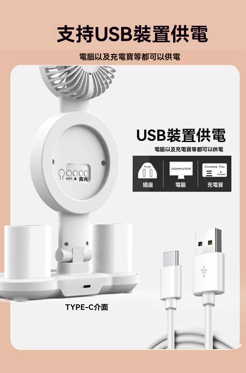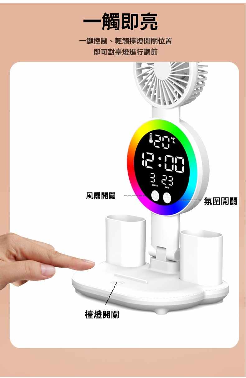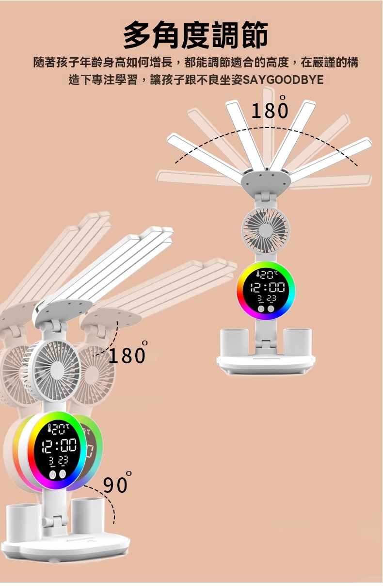 智能LED顯示屏多功能護眼檯燈(4頭氛圍燈-風扇時鐘-3200毫安鋰電池-充電款+贈送usb線)1組
