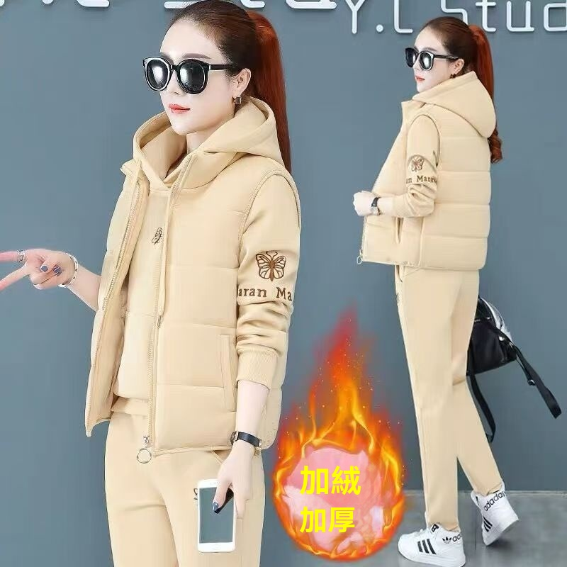 中老年加絨加厚運動服馬甲套裝【杏色】一組