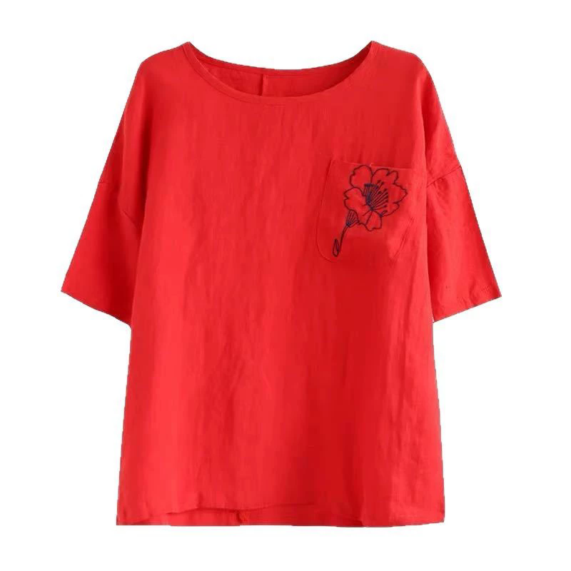 【買一送一!每件僅需549元!】花朵刺繡口袋寬鬆棉麻T恤