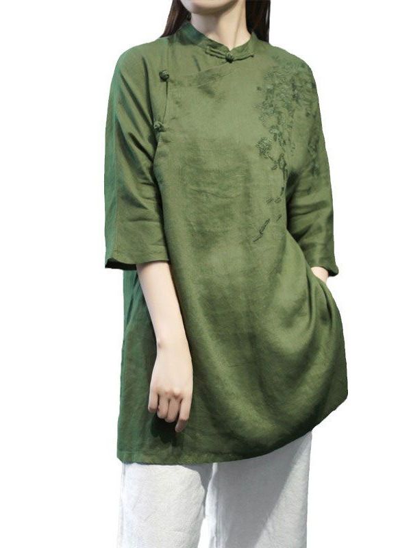 【全台免運!限時特惠買一送一!】中長款棉麻刺繡盤扣上衣