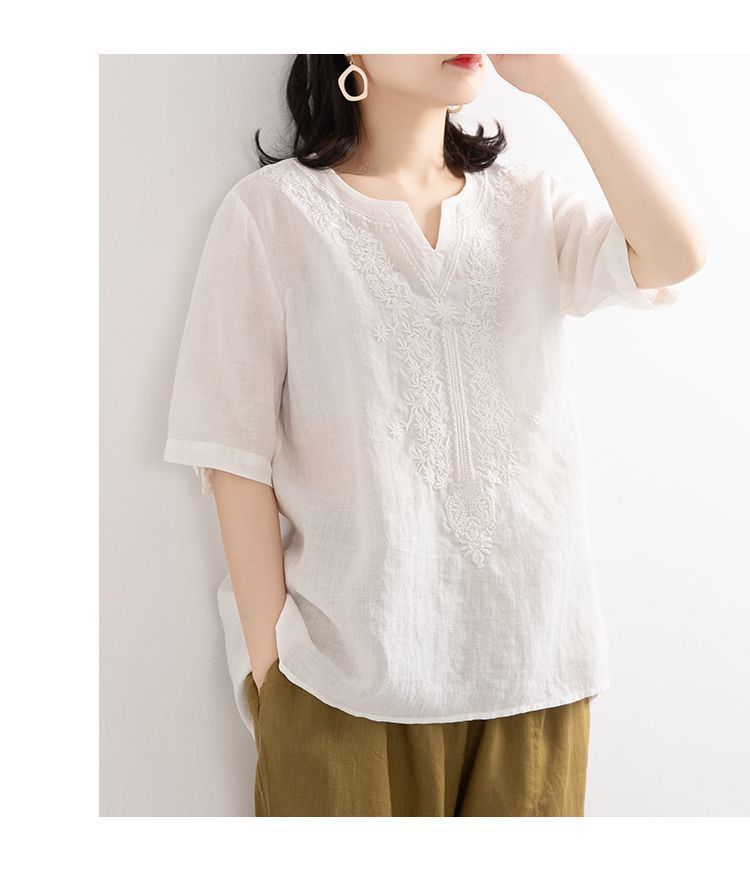 【輕薄透氣!限時買一送一!】夏季女士文藝刺繡棉麻V領T恤
