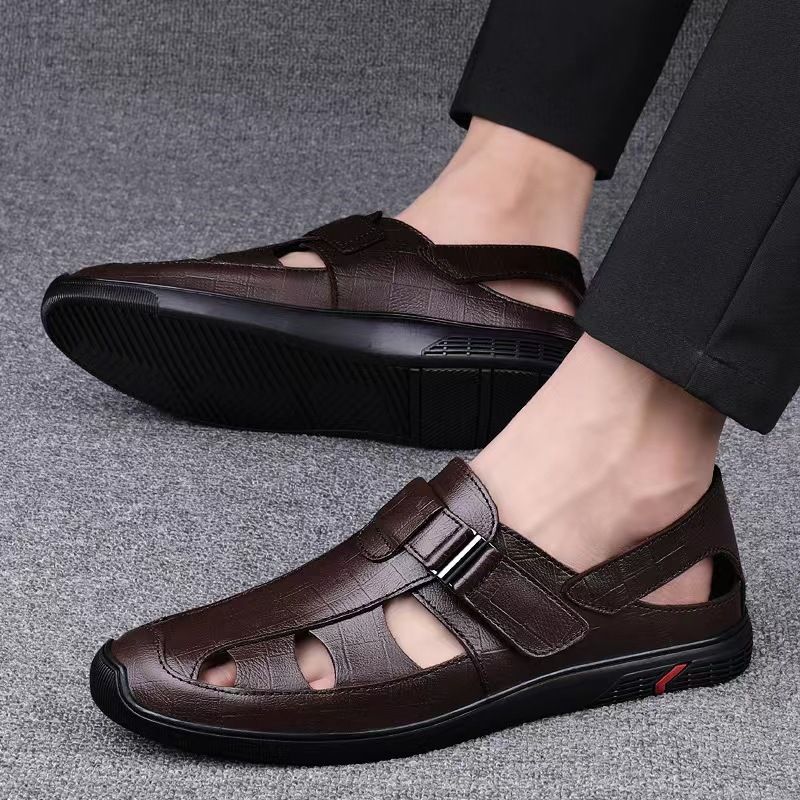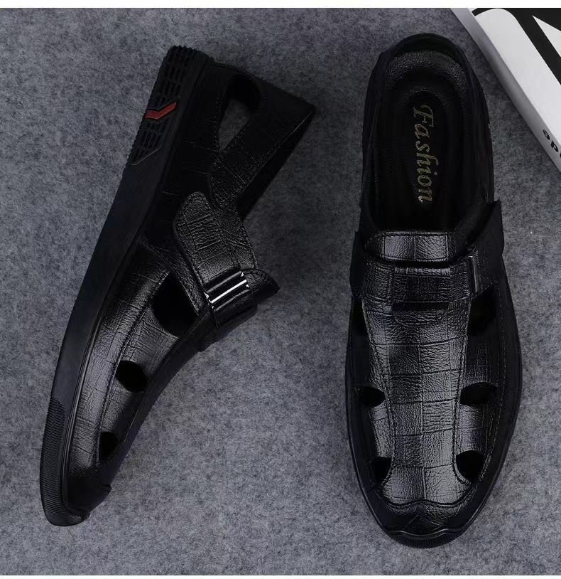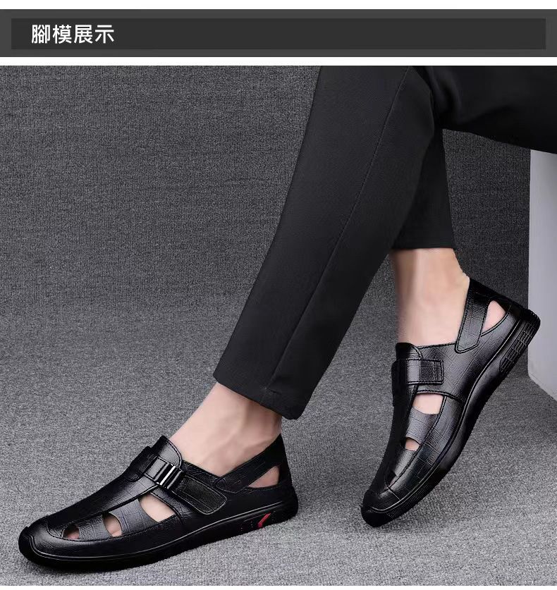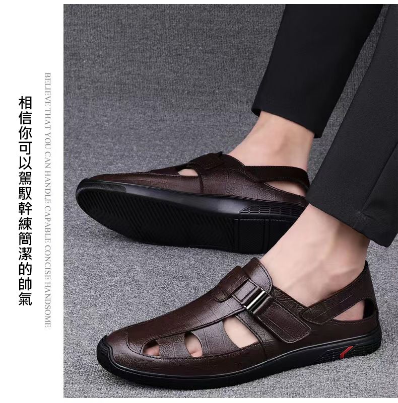 【夏季熱賣,限時買一送一!】男士軟皮透氣鏤空包頭涼皮鞋