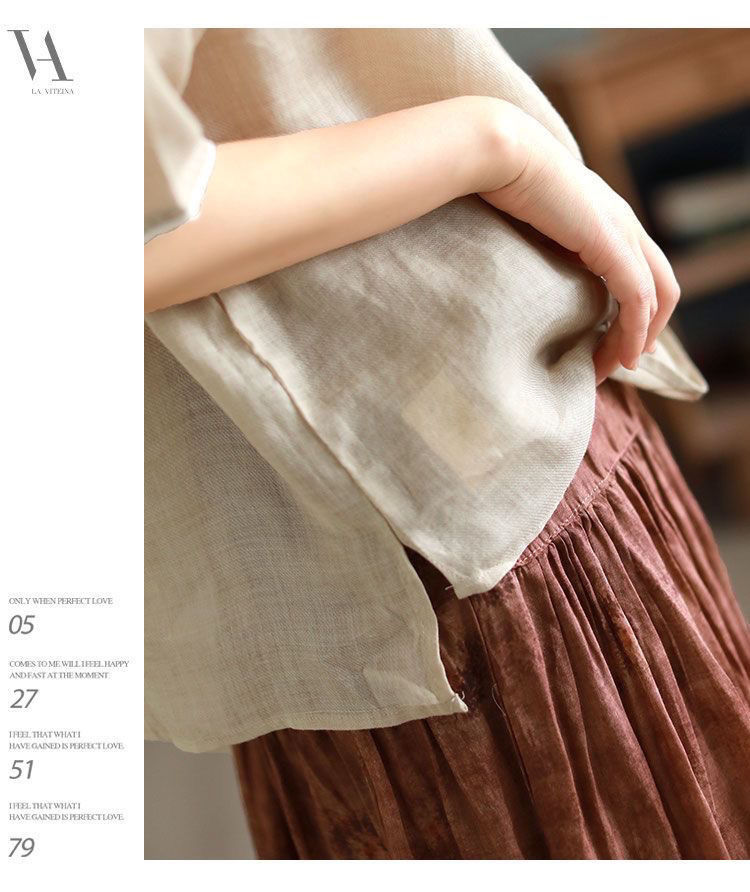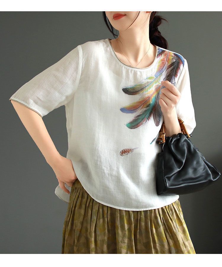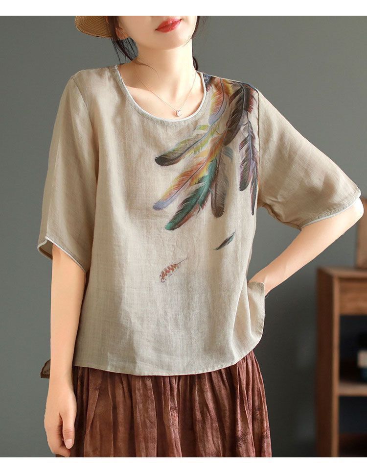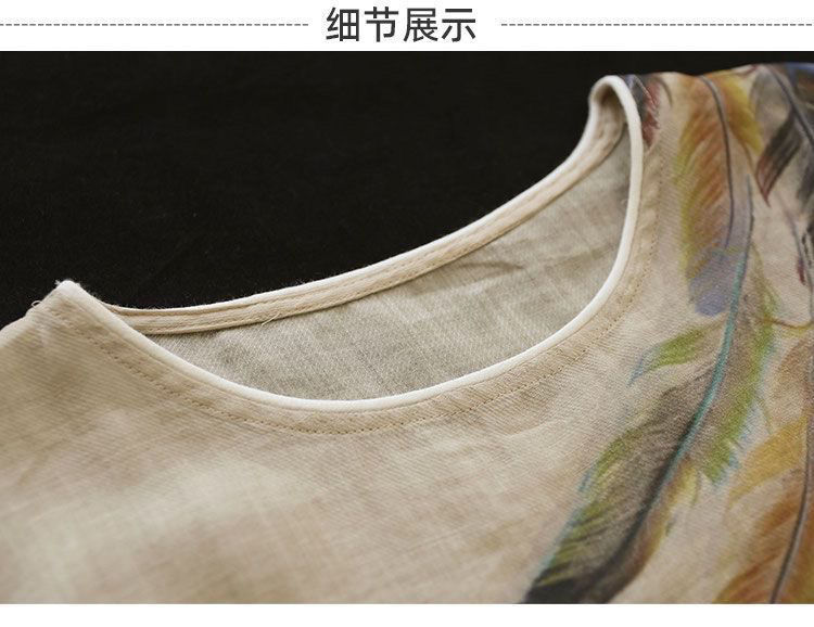 復古印花高端棉麻T恤【秒殺4件】原麻色+禪綠色+象牙白+藕色各一件(每件399元)