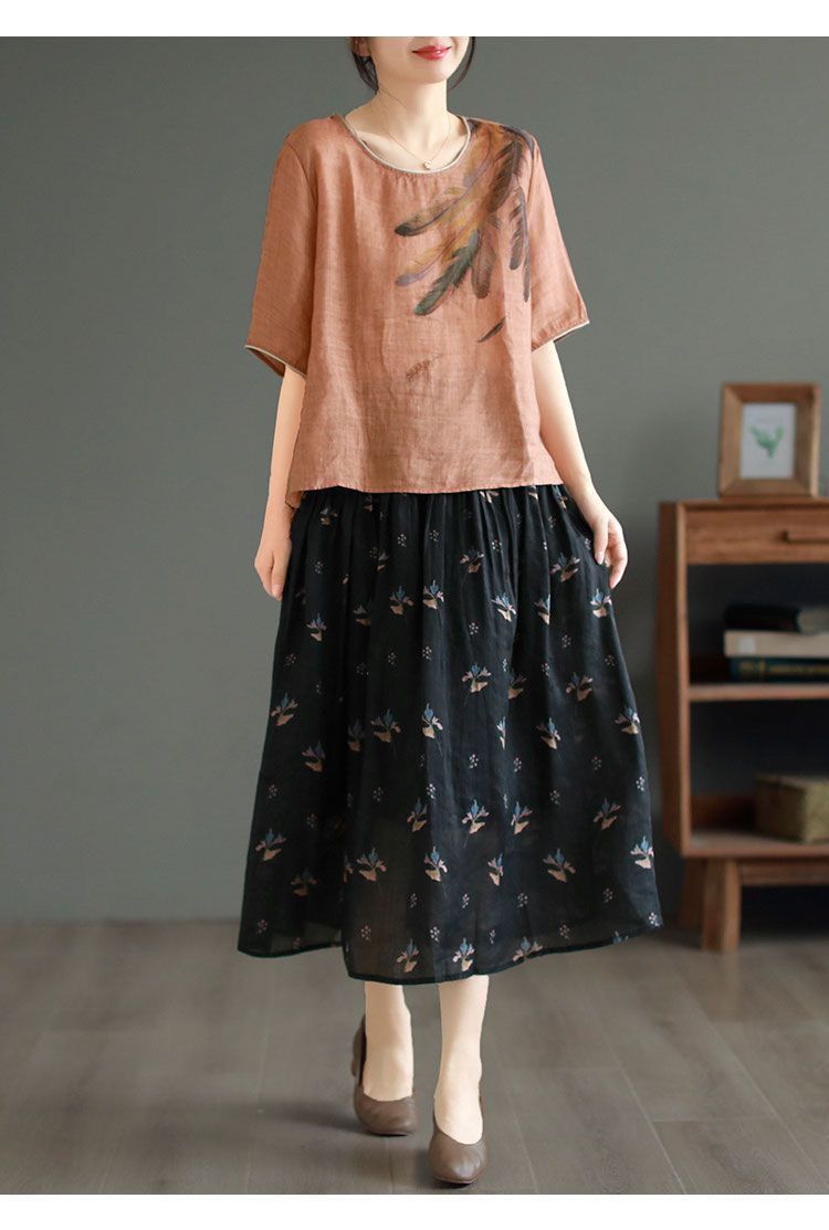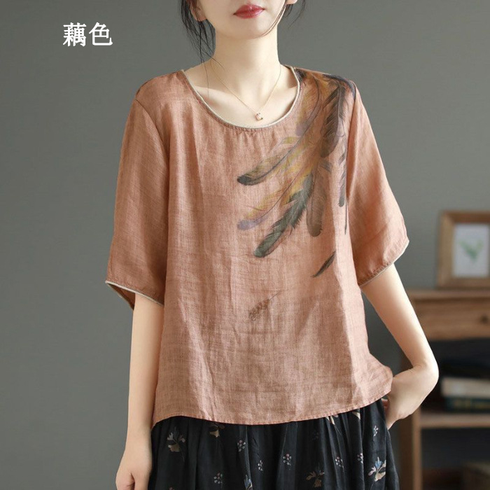復古印花高端棉麻T恤【買一送一】原麻色+藕色各一件(每件499元)