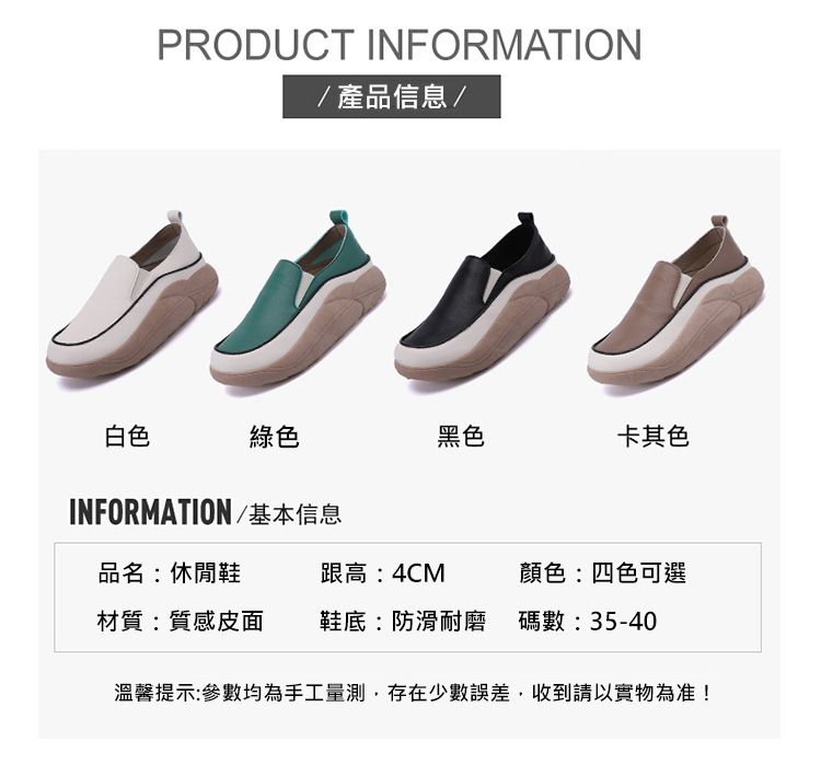 【純色皮革】女士一腳蹬厚底增高休閒小皮鞋【白色】+【綠色】各一雙(優惠400)