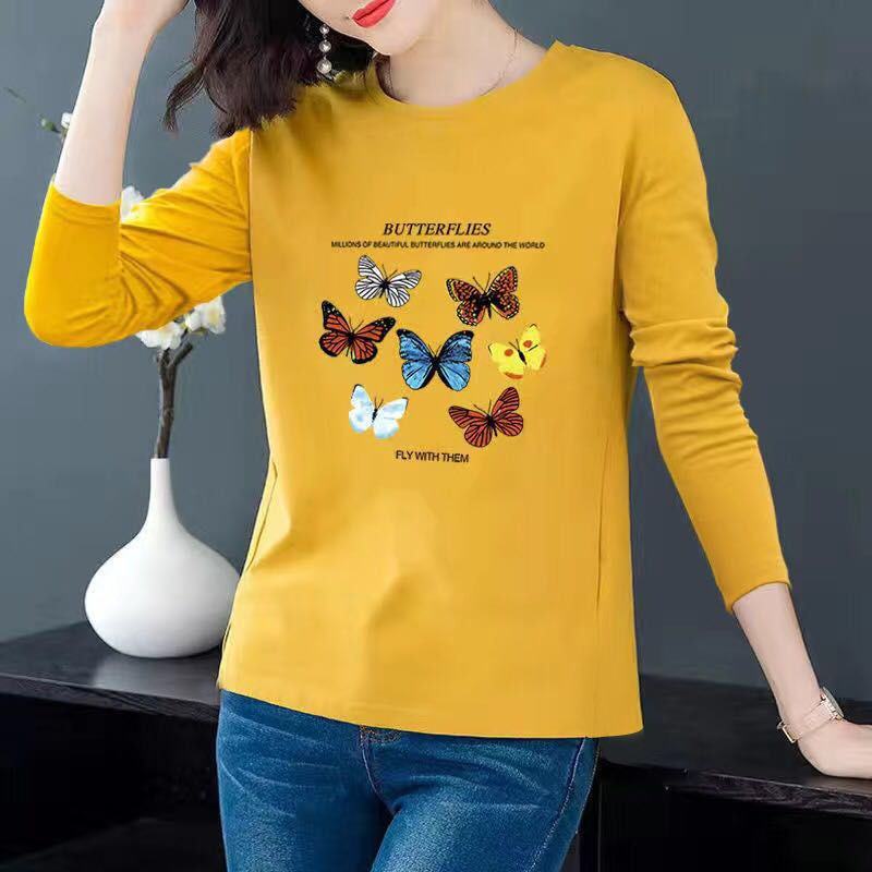 蝴蝶圖案寬鬆大碼長袖T恤【買一送二】【紅色】+【黃色】+【白色】各一件(每件僅需333元)