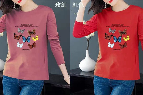 蝴蝶圖案寬鬆大碼長袖T恤【買一送二】【紅色】+【黃色】+【玫紅色】各一件(每件僅需333元)
