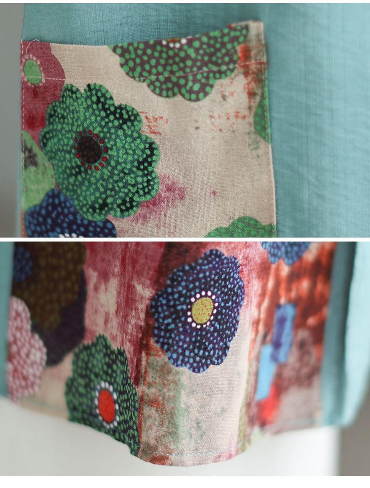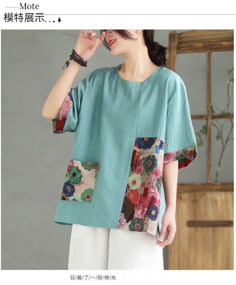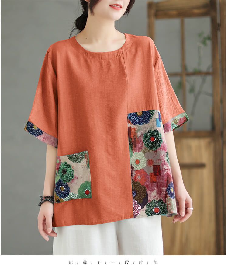 印花拼色大碼寬鬆棉麻上衣【桔紅色】+【湖藍色】各一件(到手兩件,每件均價549元)