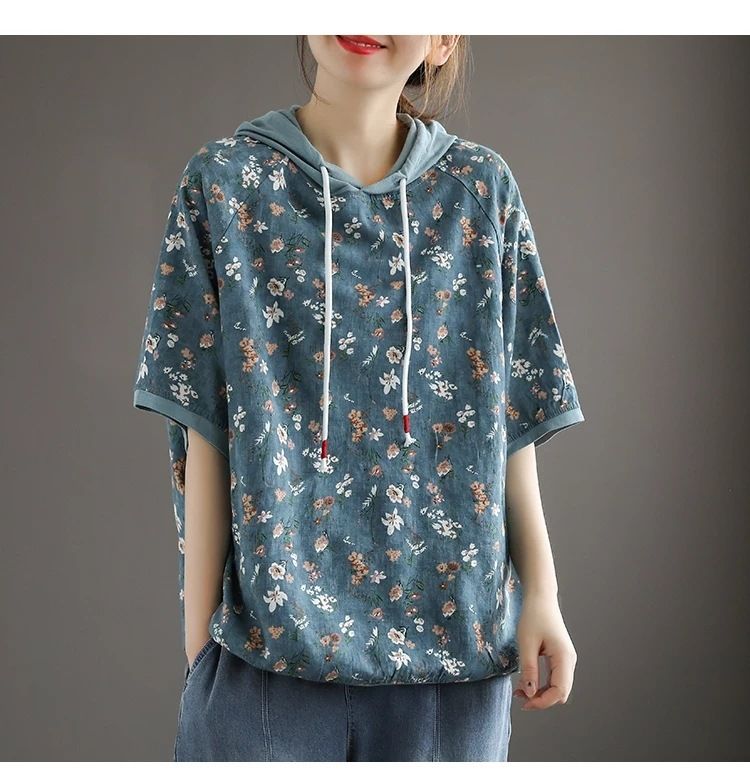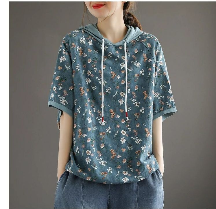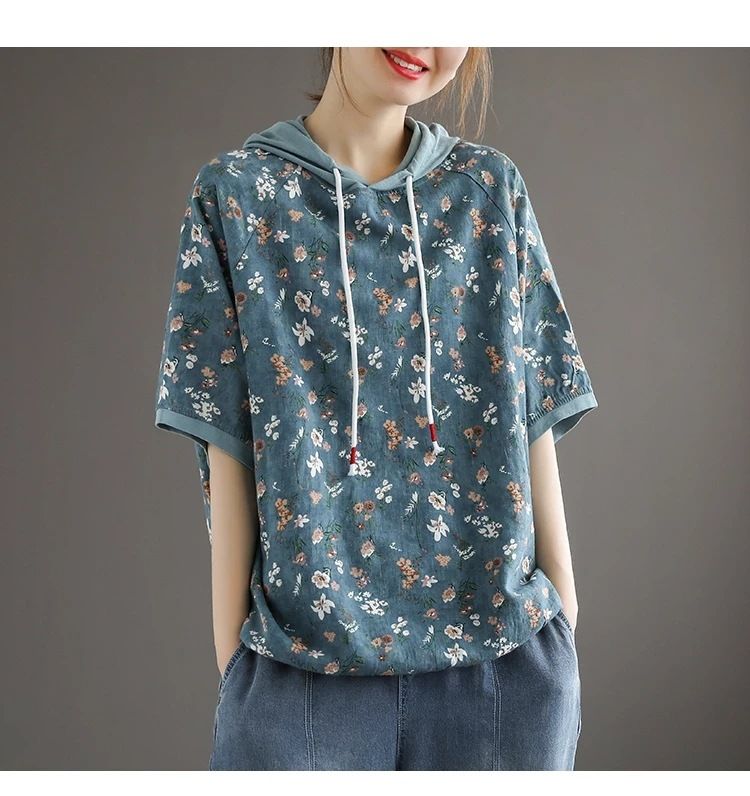 連帽復古文藝碎花寬鬆短袖上衣【買一送一】【藍色】兩件(每件僅需499元)