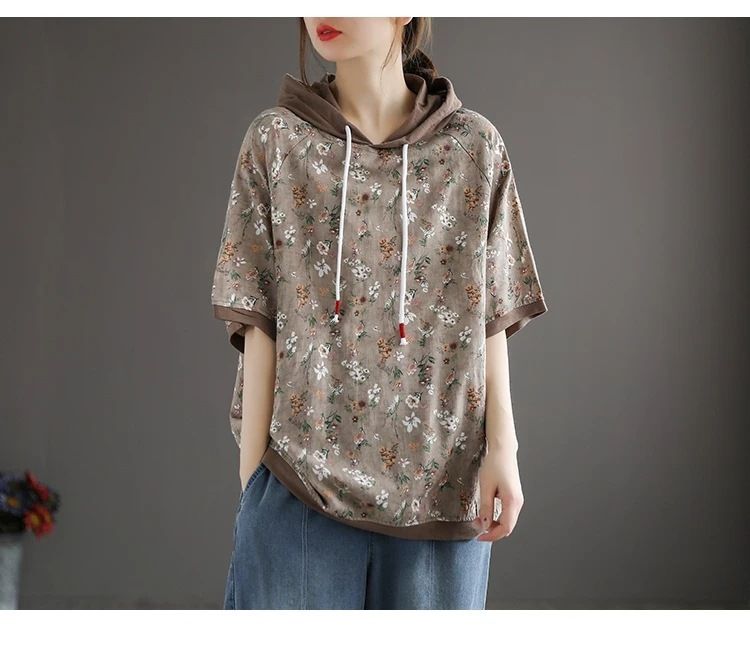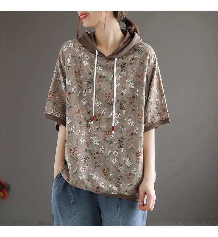連帽復古文藝碎花寬鬆短袖上衣【買一送一】【卡其色】兩件(每件僅需499元)