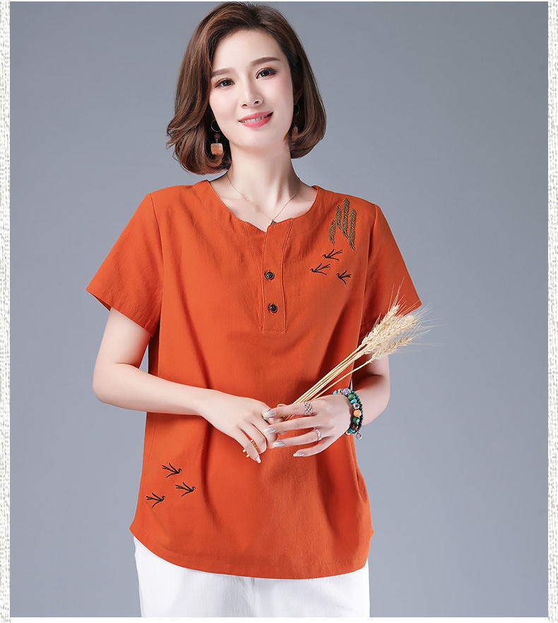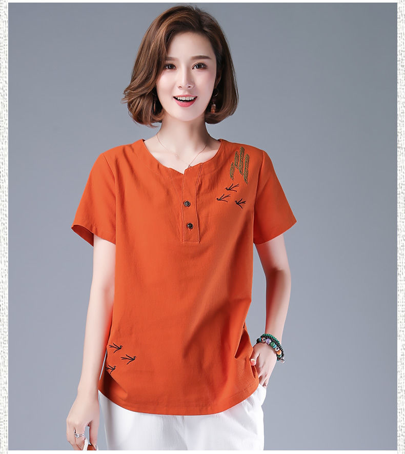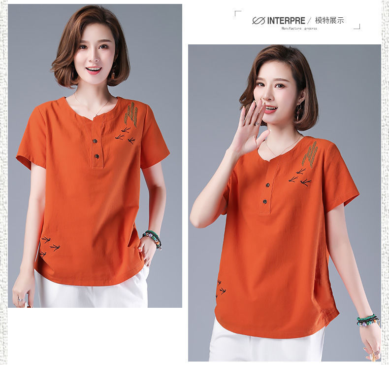 棉麻復古風短袖女士T恤【買一送一】藍色+橘色各一件(到手2件!每件均價549元!)
