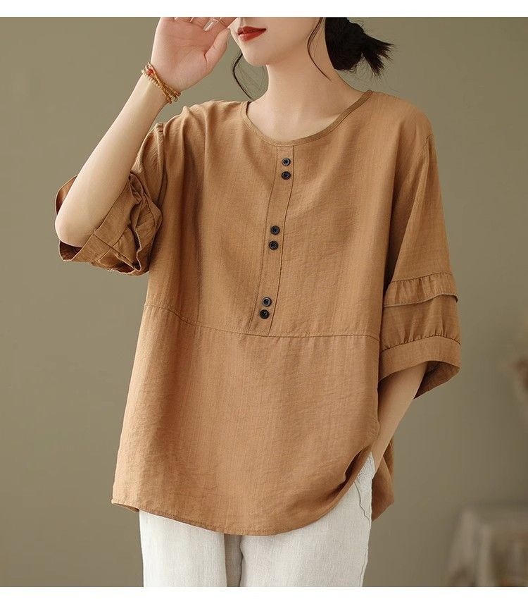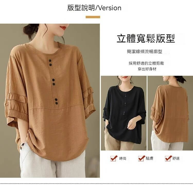 立體寬鬆顯瘦圓領排扣小衫【卡其色】兩件(到手兩件,每件均價499元)