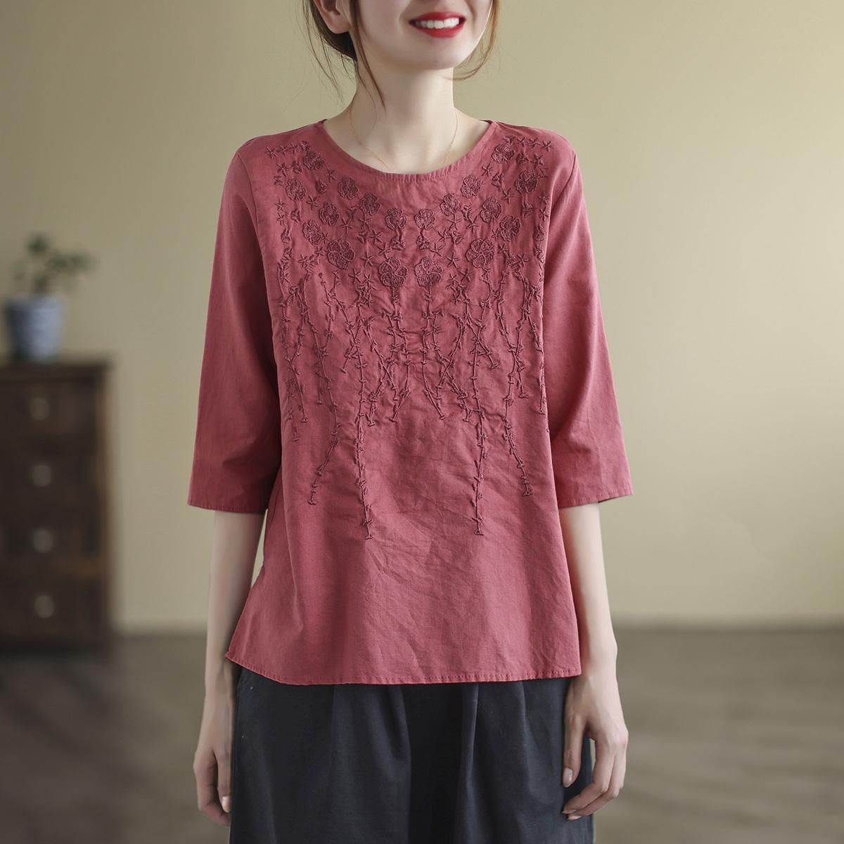 重磅好料棉麻純色刺繡寬鬆上衣【買一送一】【紅色】+【粉色】各一件(到手兩件,每件均價549元)