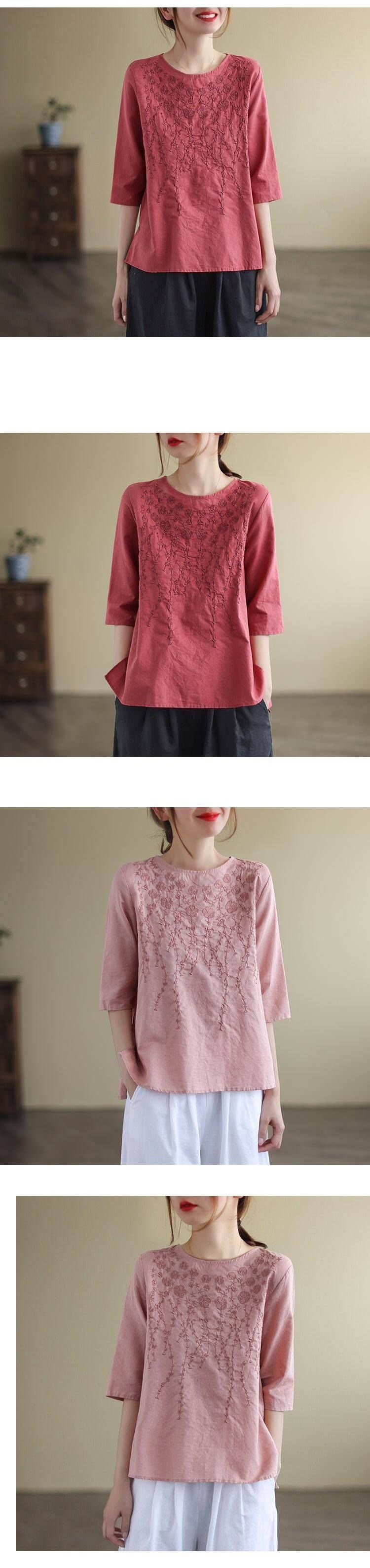 重磅好料棉麻純色刺繡寬鬆上衣【加200秒殺3件!】【藍色】+【紅色】+【粉色】各一件(到手3件,每件均價432元)