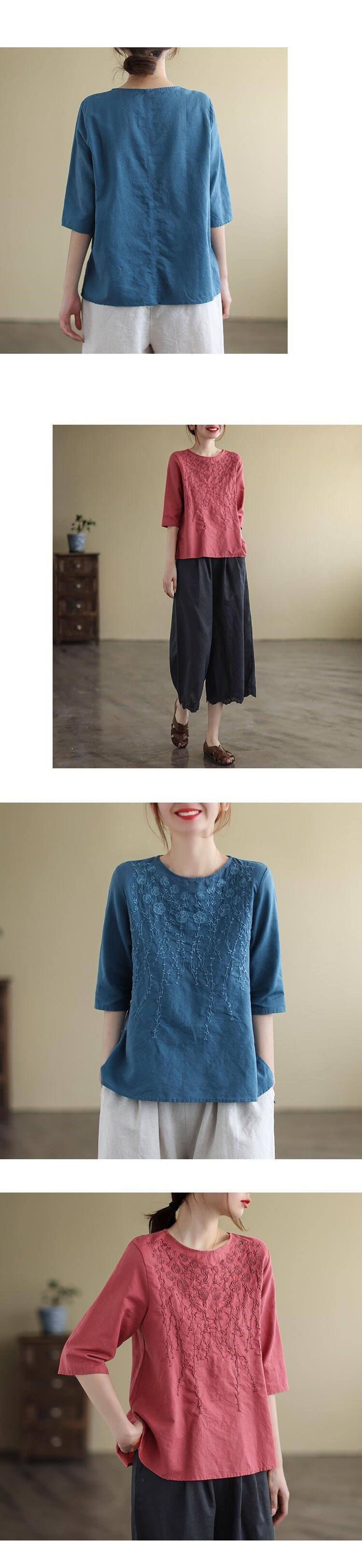 重磅好料棉麻純色刺繡寬鬆上衣【買一送一】【藍色】+【紅色】各一件(到手兩件,每件均價549元)