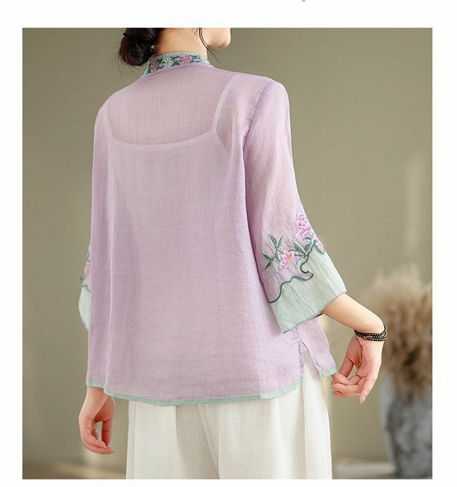 盤扣復古拼色棉麻立領刺繡七分袖上衣【買一送一】【粉色】+【紫色】各一件(到手兩件,每件均價649元)