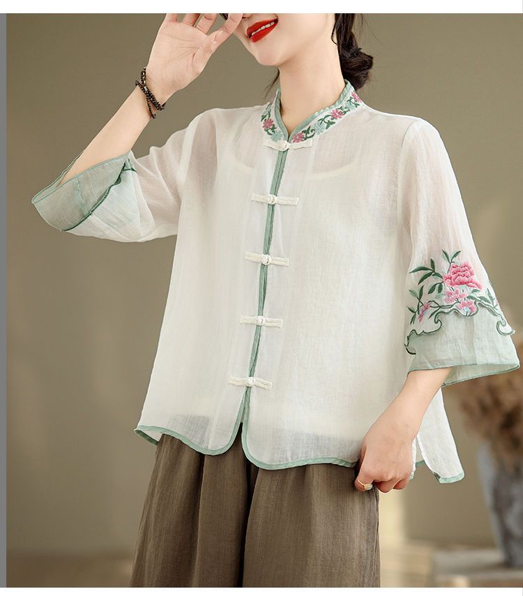 盤扣復古拼色棉麻立領刺繡七分袖上衣【買一送一】【白色】+【綠色】各一件(到手兩件,每件均價649元)