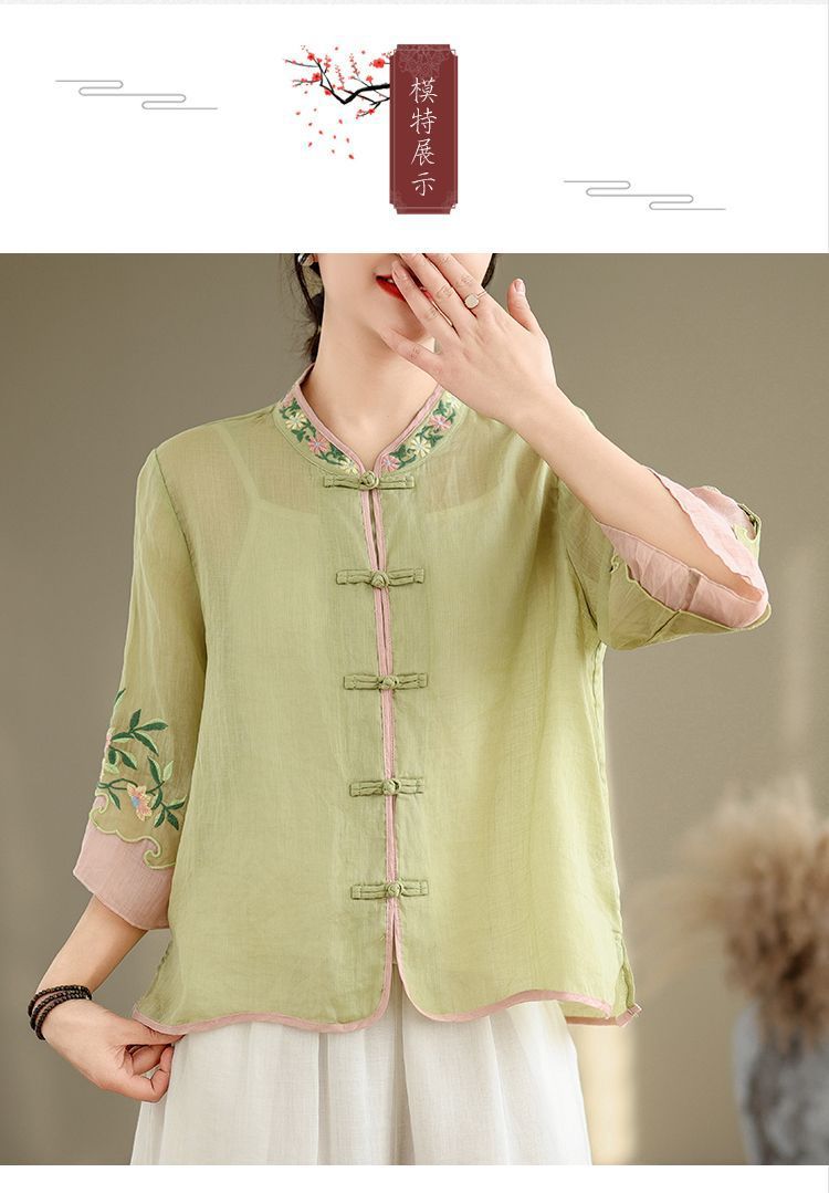 盤扣復古拼色棉麻立領刺繡七分袖上衣【買一送一】【粉色】+【綠色】各一件(到手兩件,每件均價649元)