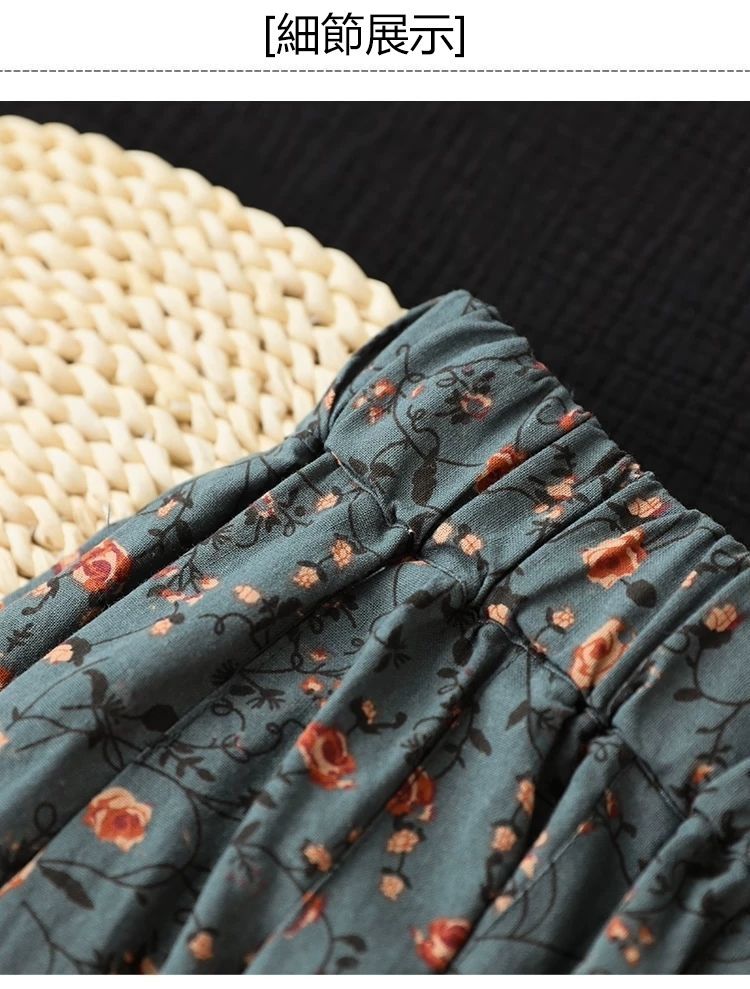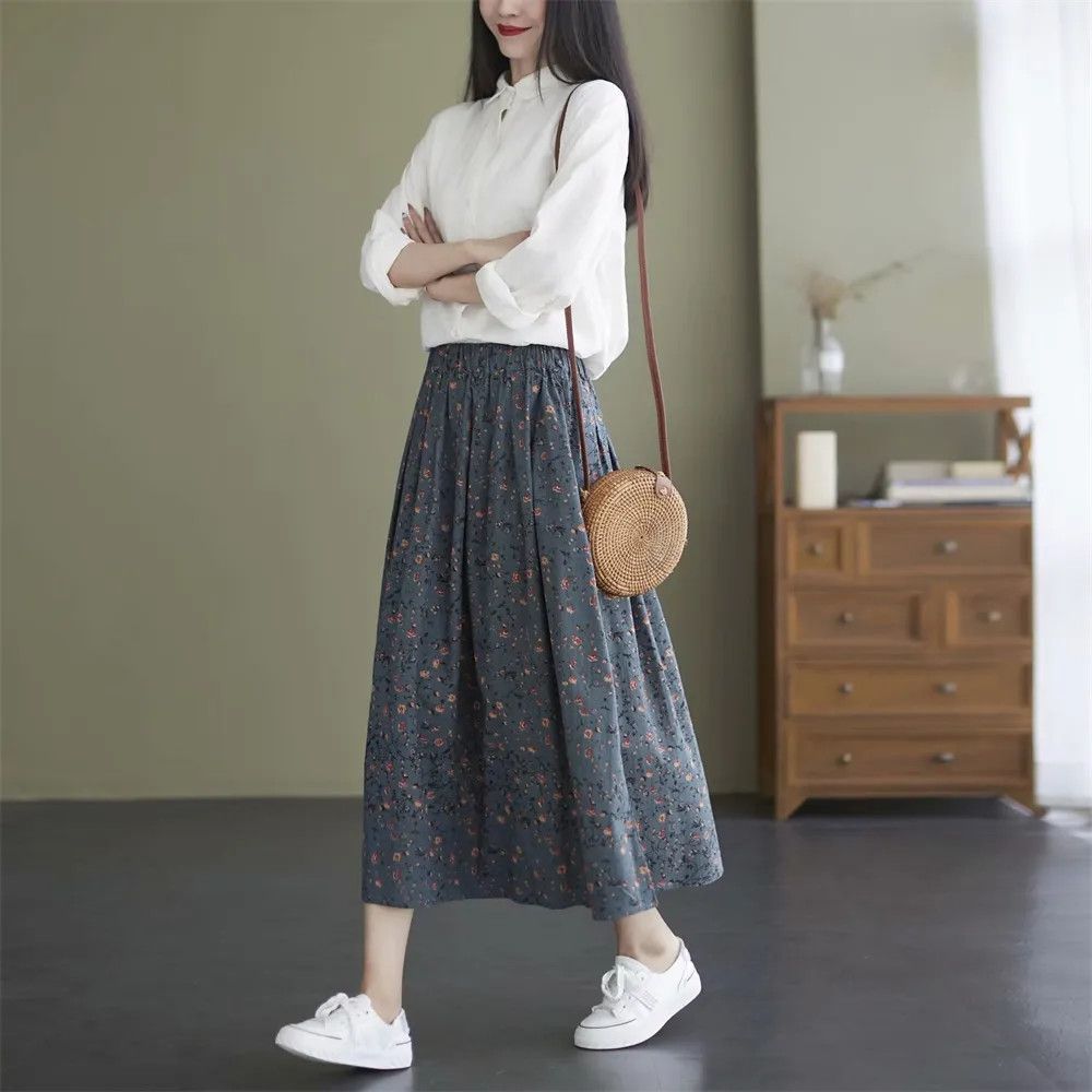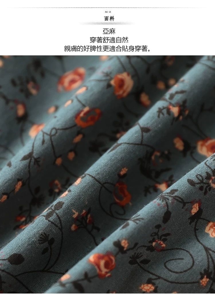 高腰顯瘦中長款棉麻碎花裙【買一送一】【灰藍色】+【深卡色】各一條(到手兩條,每條均價549元)
