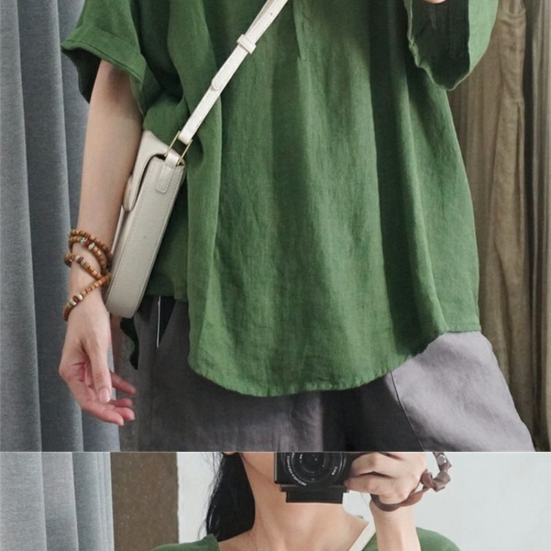 半袖棉麻休閒上衣【綠色】+【杏色】各一件(到手兩件,每件均價499元)