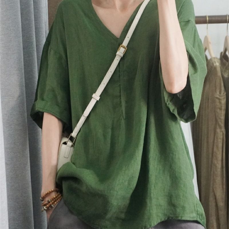 半袖棉麻休閒上衣【綠色】+【白色】各一件(到手兩件,每件均價499元)