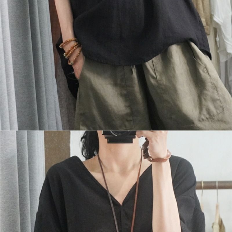 半袖棉麻休閒上衣【黑色】+【杏色】各一件(到手兩件,每件均價499元)