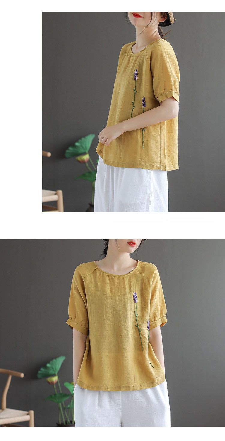 花朵刺繡棉麻T恤【秒殺4件】紫色+黃色各兩件(每件399元)