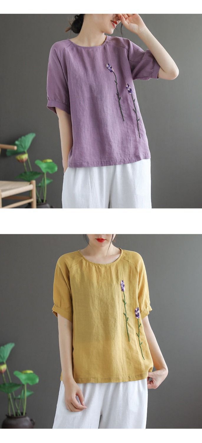 花朵刺繡棉麻T恤【買一送一】紫色+黃色各一件(每件499元)