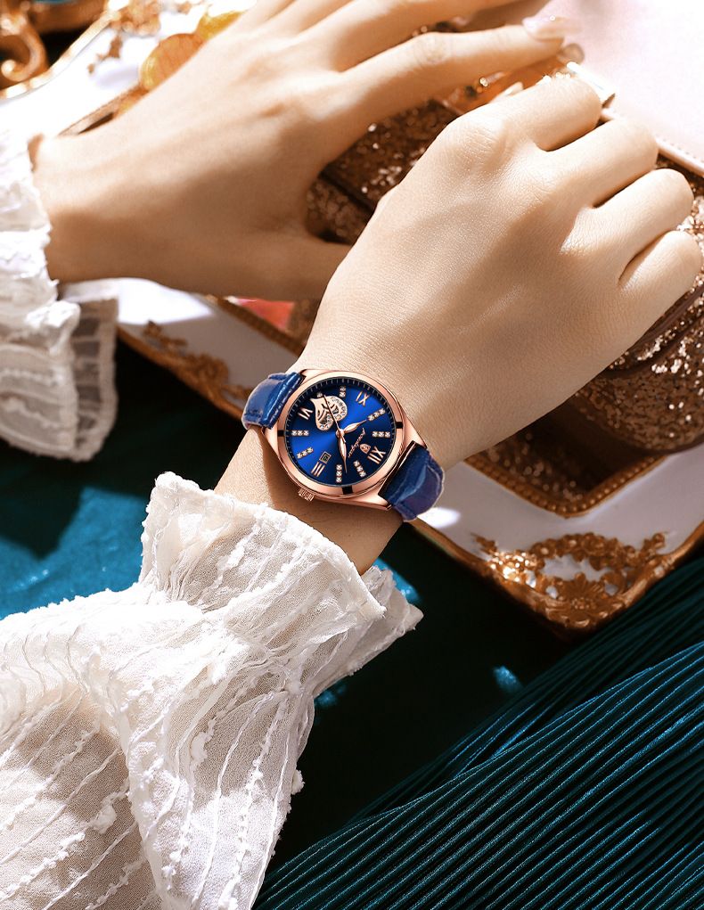 新款防水夜光日曆韓版女錶【皮帶玫金藍面】一組