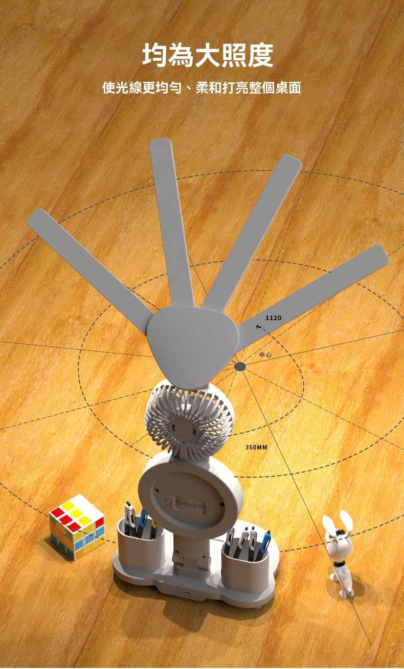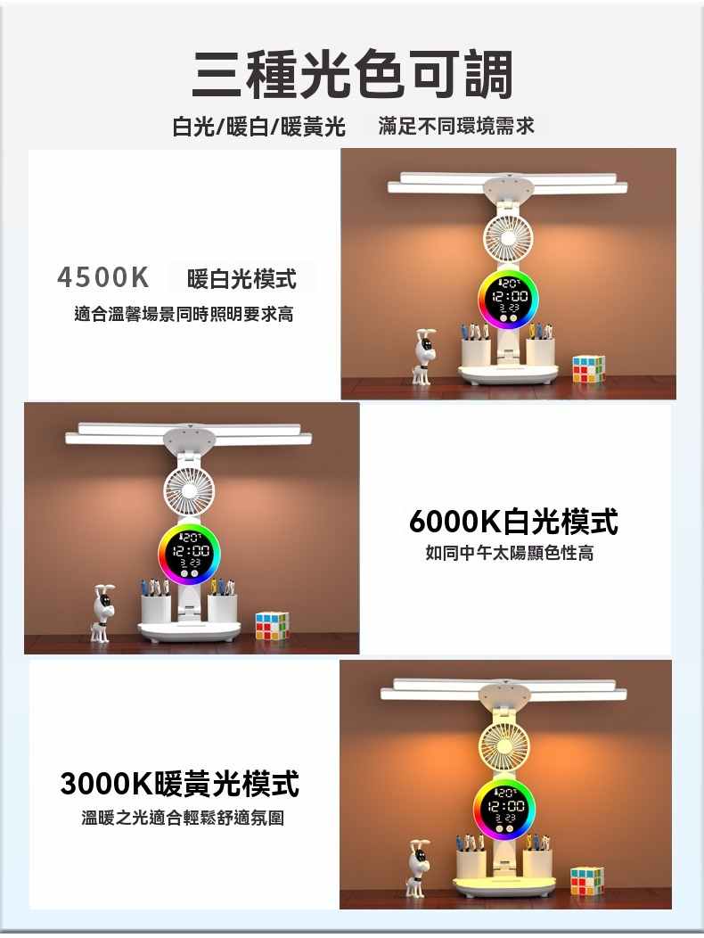 智能LED顯示屏多功能護眼檯燈(4頭氛圍燈-風扇時鐘-3200毫安鋰電池-充電款+贈送usb線)1組