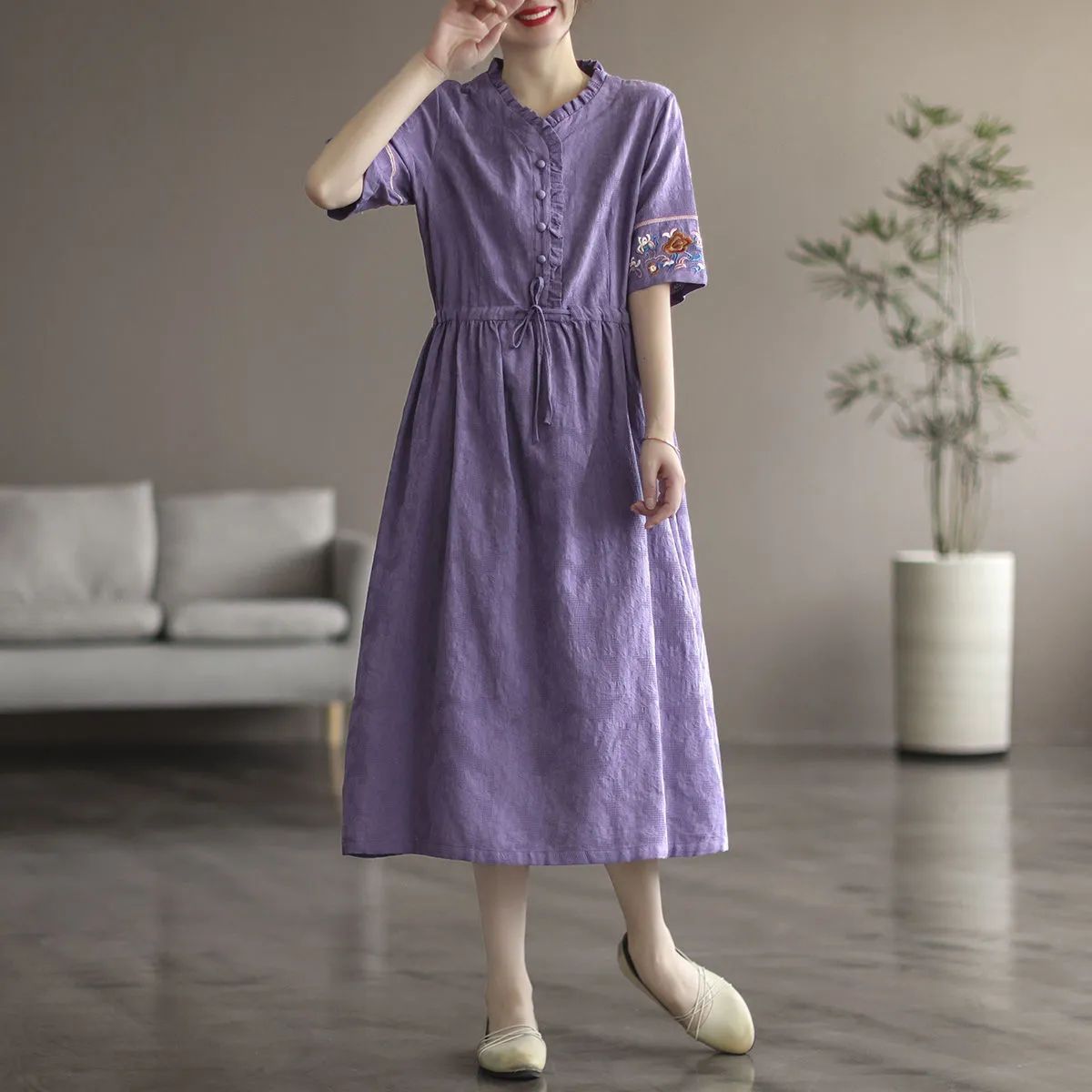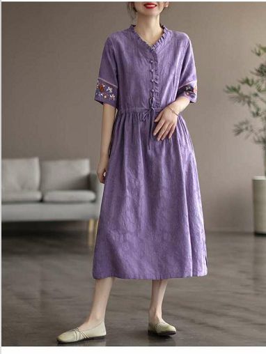收腰抽繩顯瘦棉麻中長款連衣裙【紫色】一件