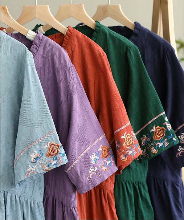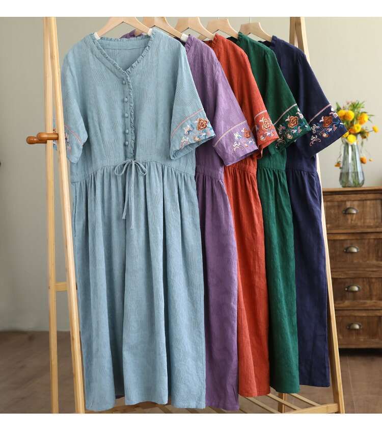 收腰抽繩顯瘦棉麻中長款連衣裙【加400元得2件!】【紫色】+【藍色】各一件