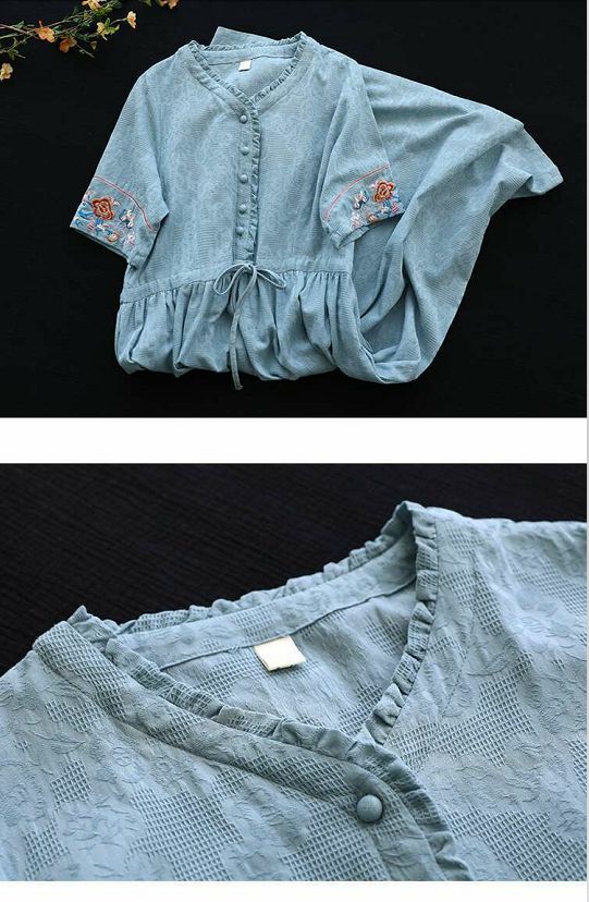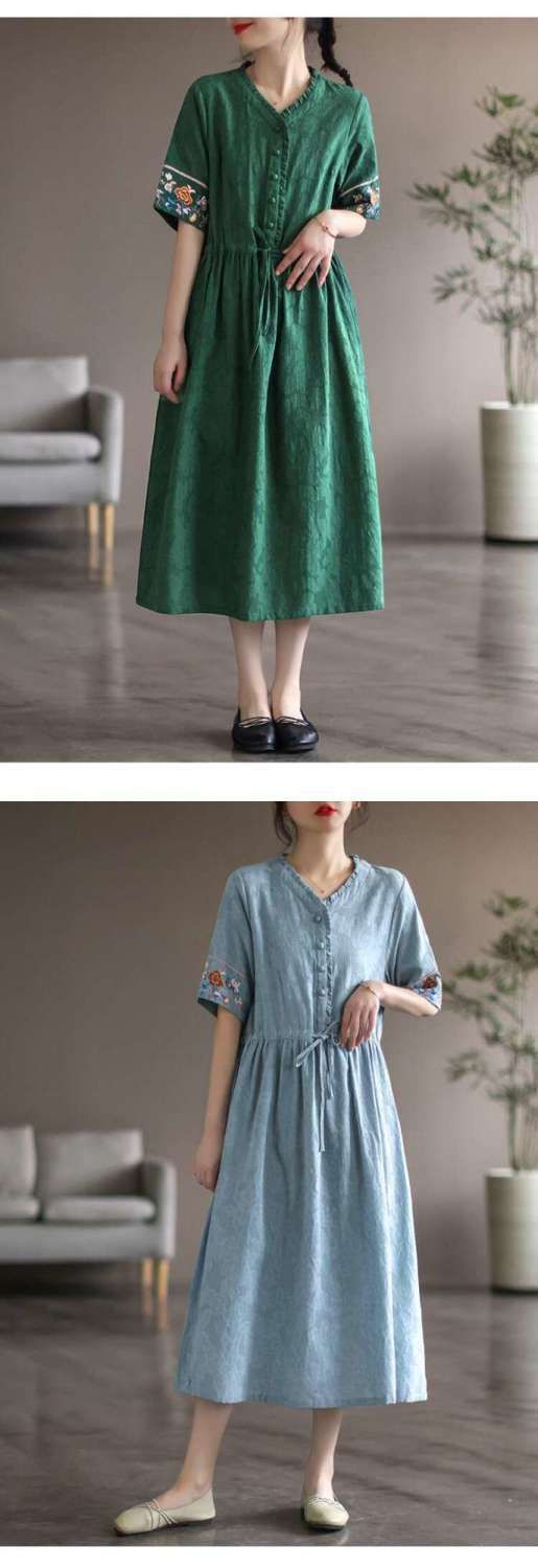 收腰抽繩顯瘦棉麻中長款連衣裙【加400元得2件!】【藍色】+【綠色】各一件