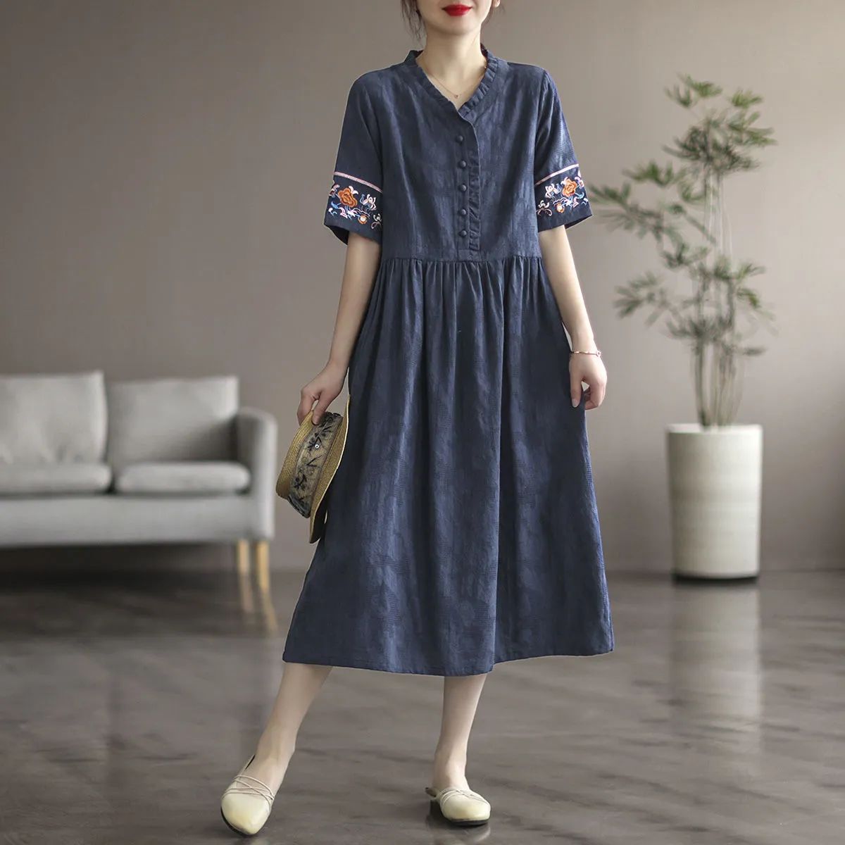 收腰抽繩顯瘦棉麻中長款連衣裙【加400元得2件!】【藍色】+【藏青色】各一件