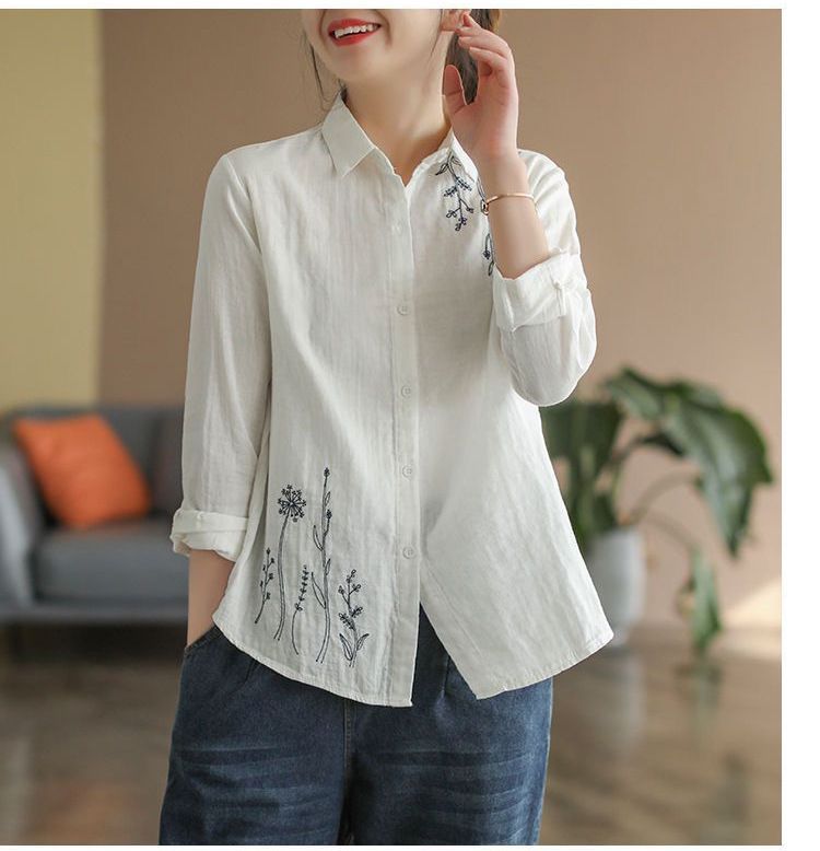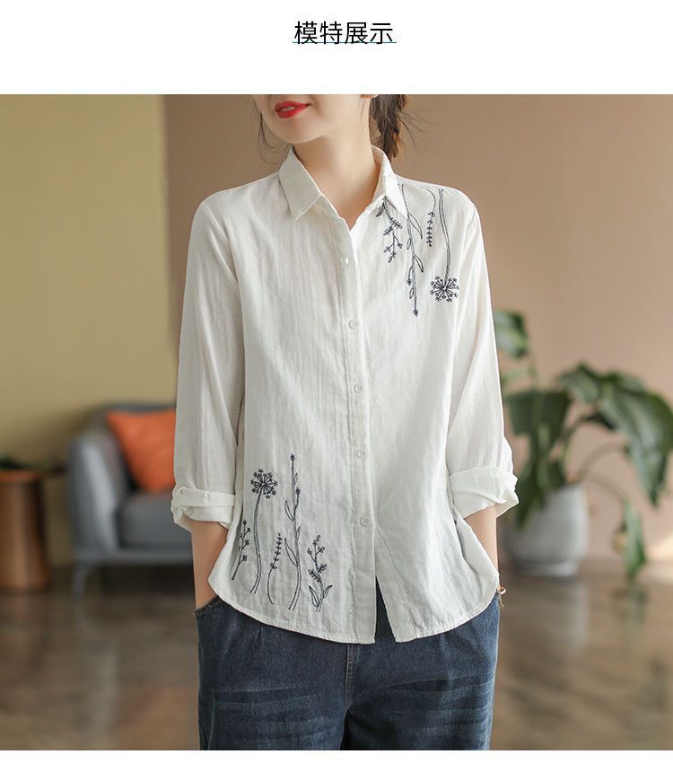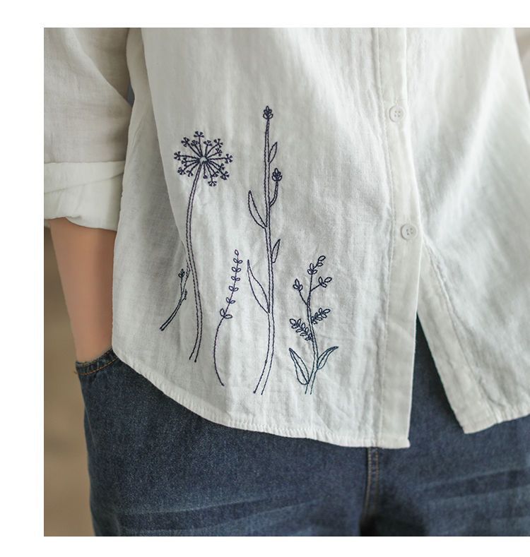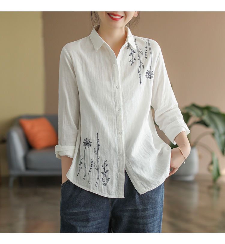 純棉簡約花卉刺繡長袖襯衣【買一送一】【白色】+【藍色】各一件(到手兩件,每件均價549元)