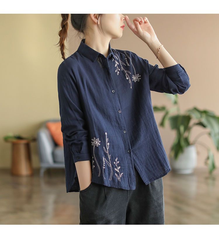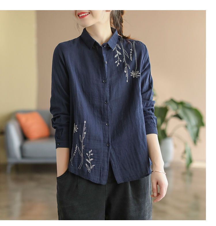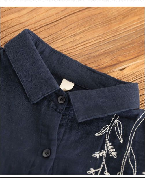 純棉簡約花卉刺繡長袖襯衣【買一送一】【藍色】兩件(到手兩件,每件均價549元)