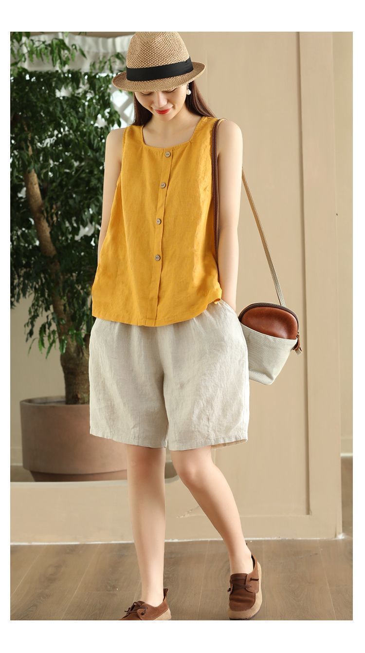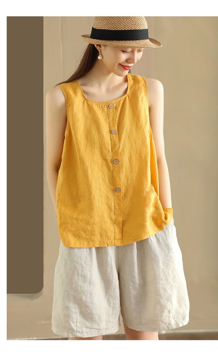 簡約鈕扣裝飾棉麻無袖T恤【買一送二】黃色+咖色+藍色各一件(到手3件!每件均價333元!)