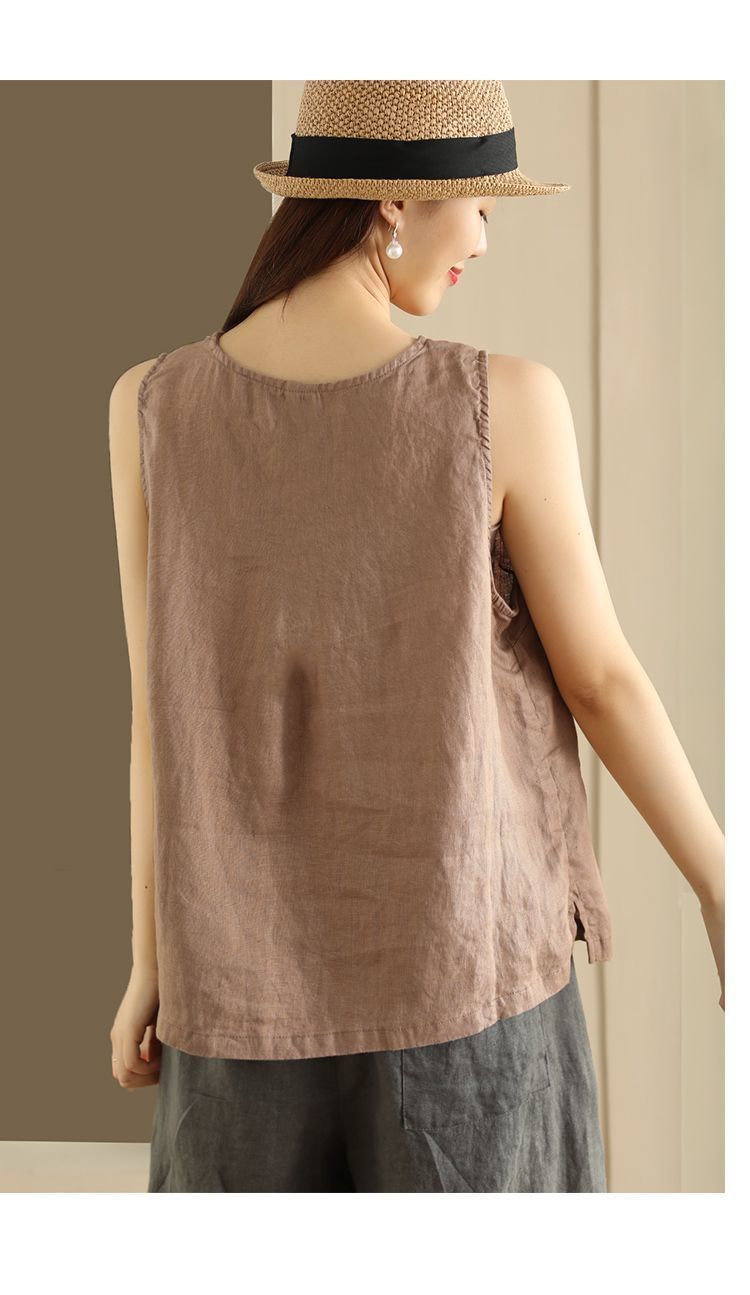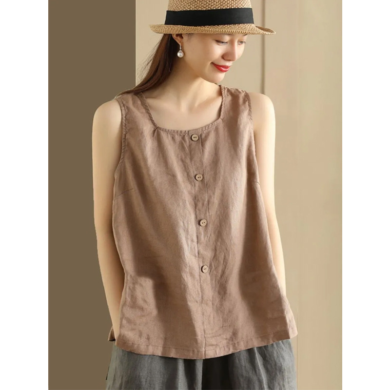 簡約鈕扣裝飾棉麻無袖T恤【買一送二】咖色兩件+藍色一件(到手3件!每件均價333元!)
