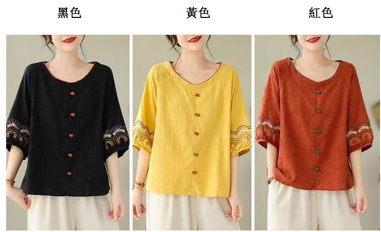 簡約淡雅棉麻半袖刺繡上衣【買一送一】【黃色】+【紅色】各一件(到手兩件,每件均價649元)