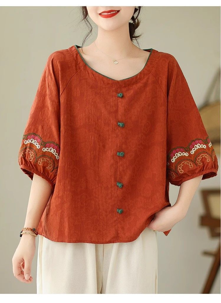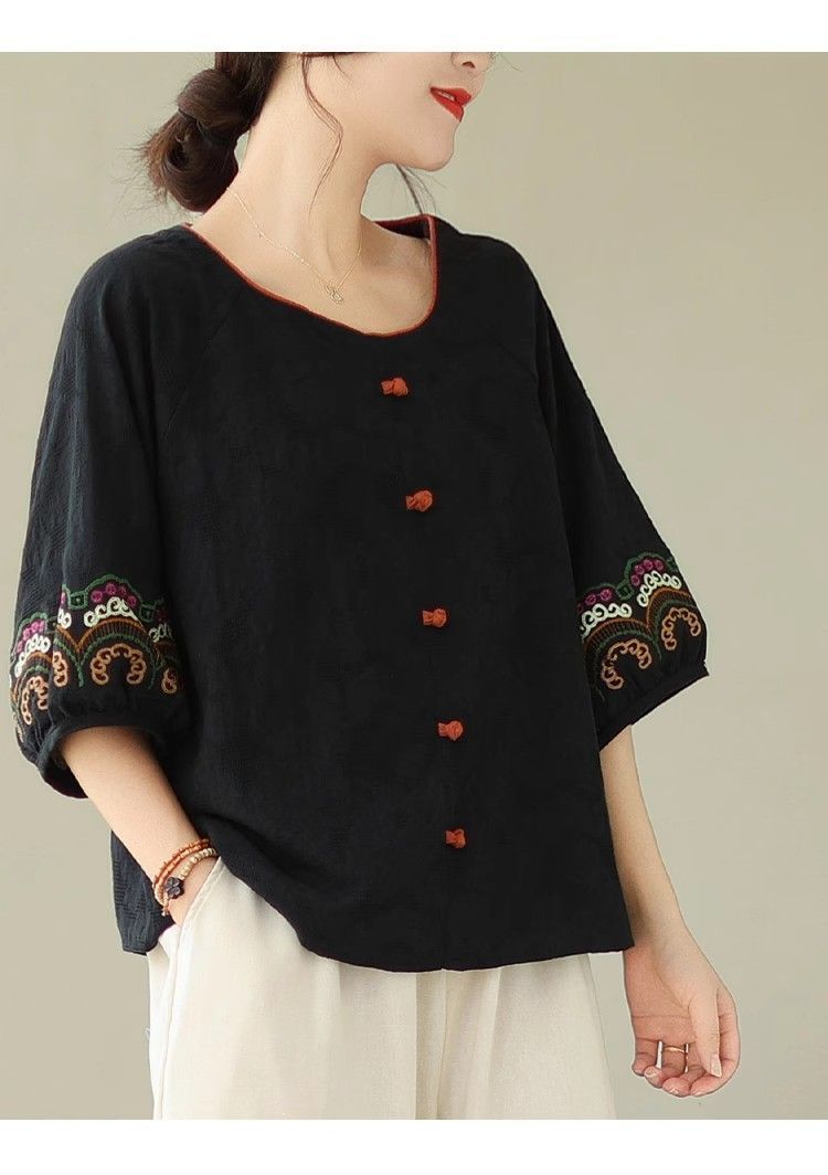 簡約淡雅棉麻半袖刺繡上衣【買一送一】【紅色】+【黑色】各一件(到手兩件,每件均價649元)