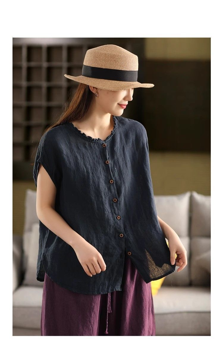 涼快寬鬆花邊領紐扣棉麻上衣【藏青色】+【麻本色】各一件(到手兩件,每件均價549元)