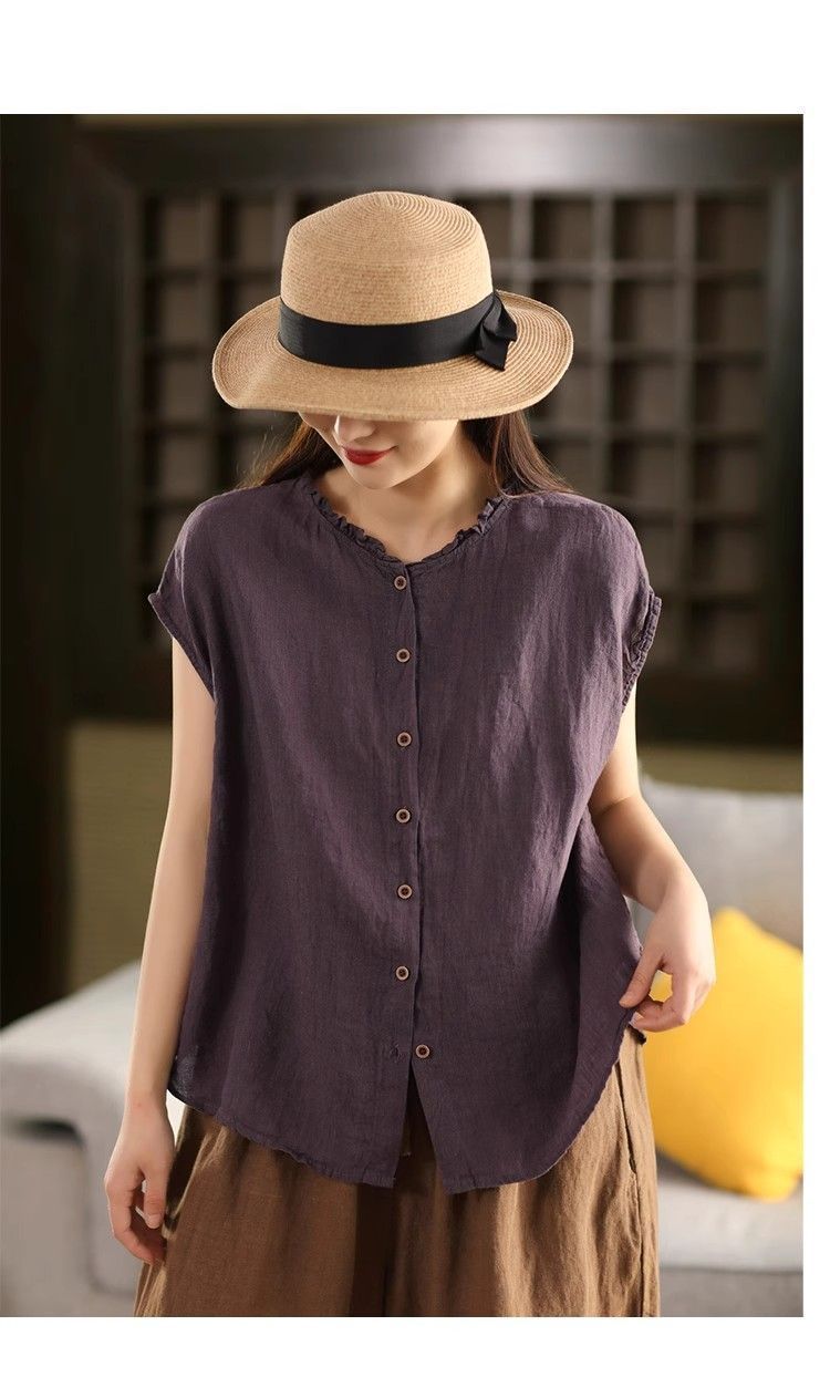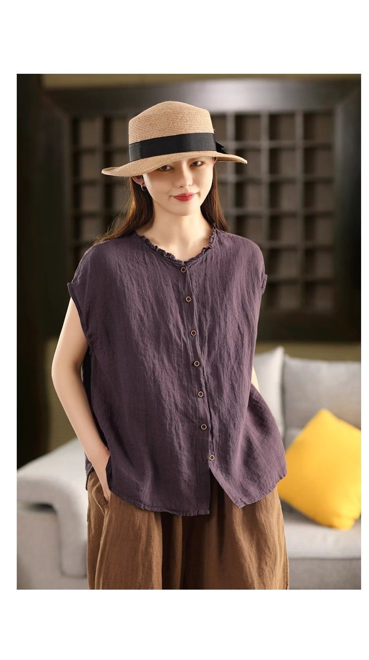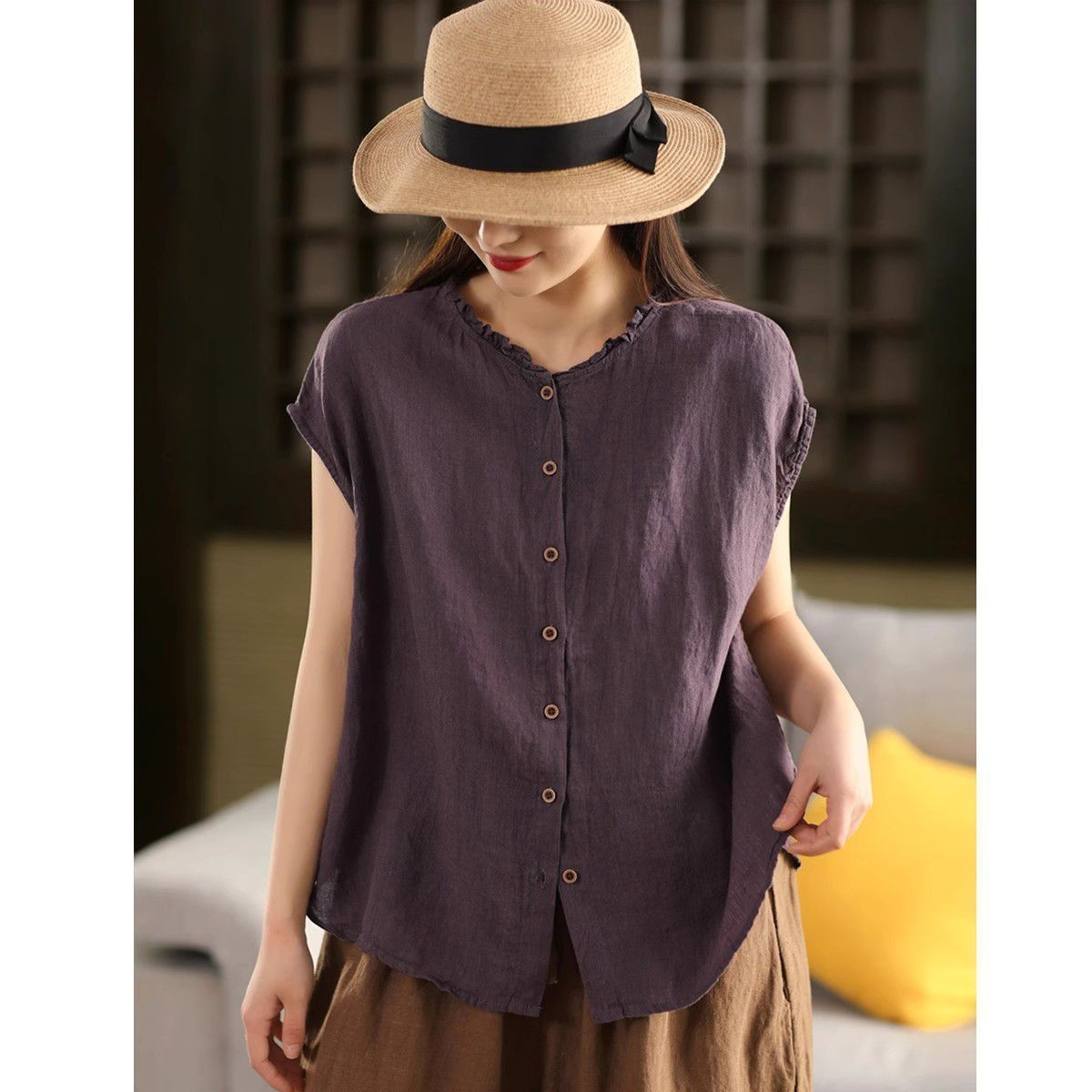 涼快寬鬆花邊領紐扣棉麻上衣【煙紫色】+【麻本色】各一件(到手兩件,每件均價549元)