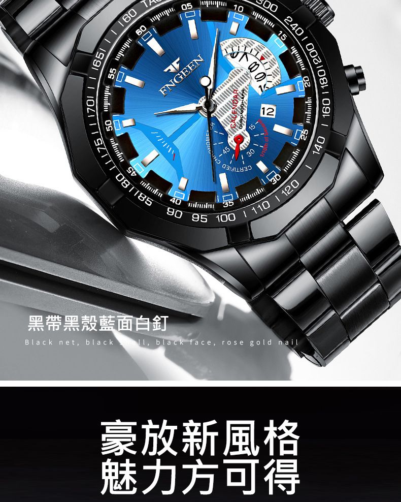【美學新風尚】超大新日曆大錶盤男士手錶【黑鋼藍面】一塊