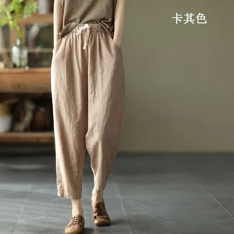 棉麻復古寬鬆純色百搭休閒九分褲【買一送一】【卡其色】+【原麻色】各一件(到手兩條,每條均價549元)