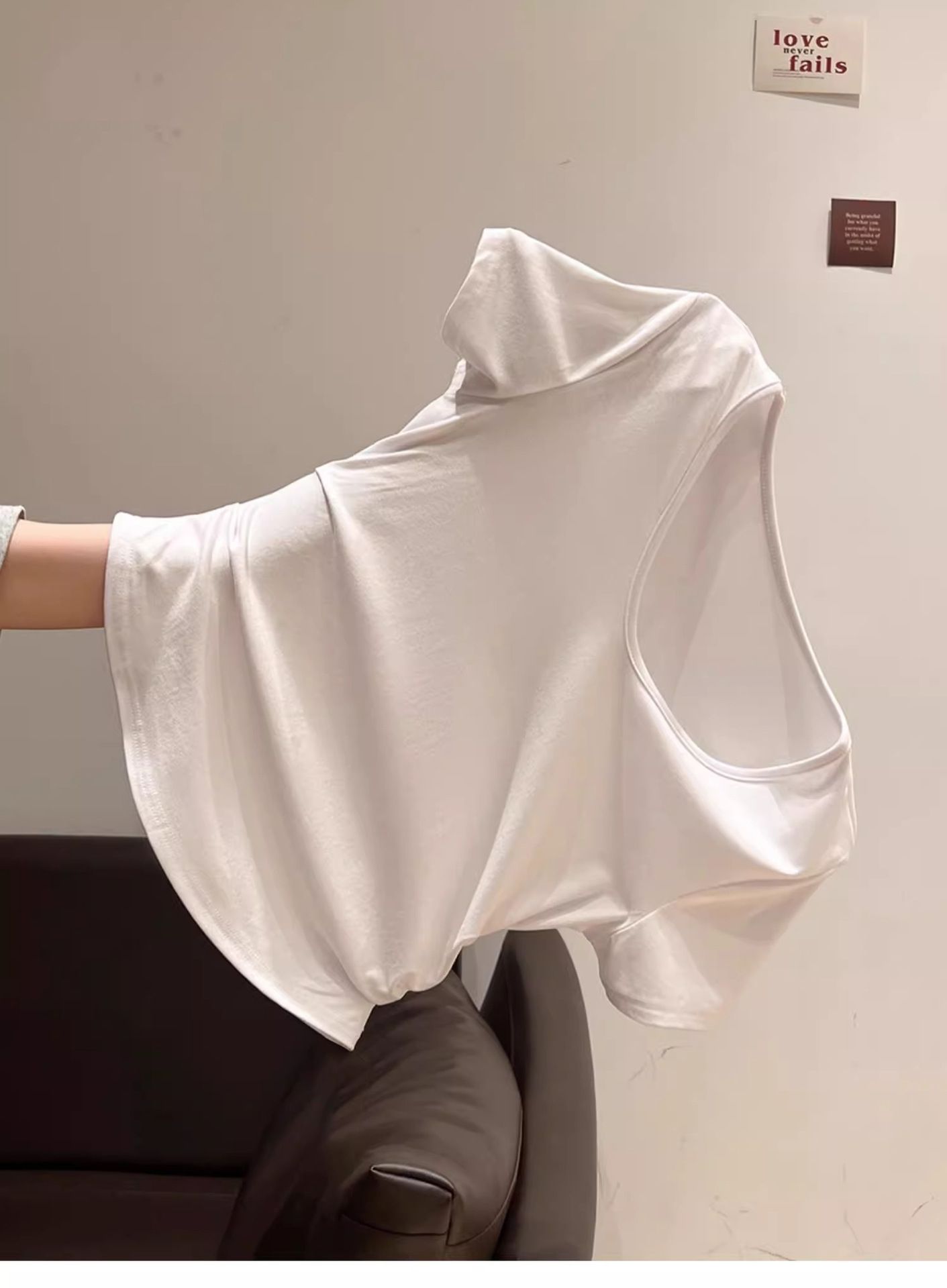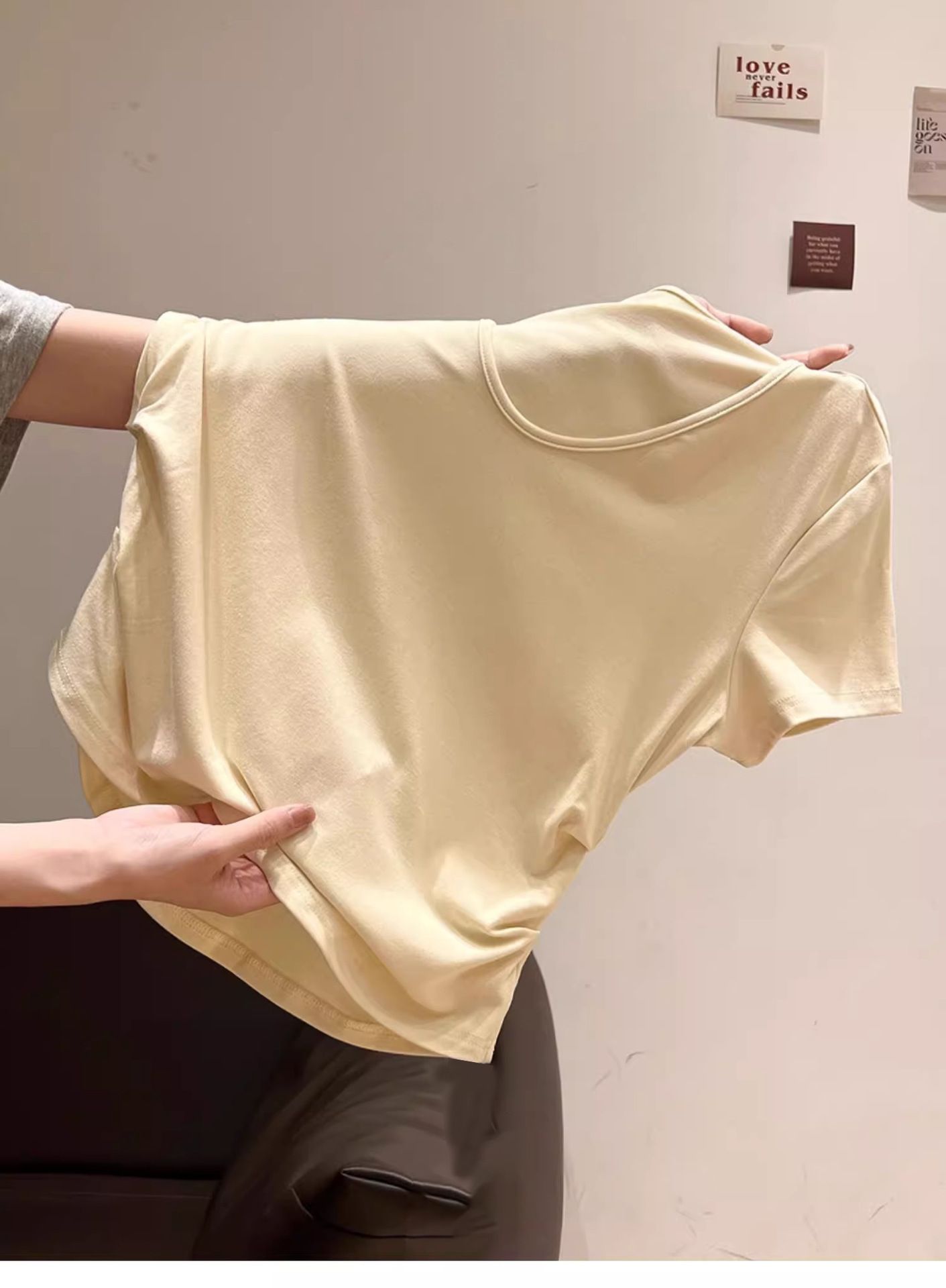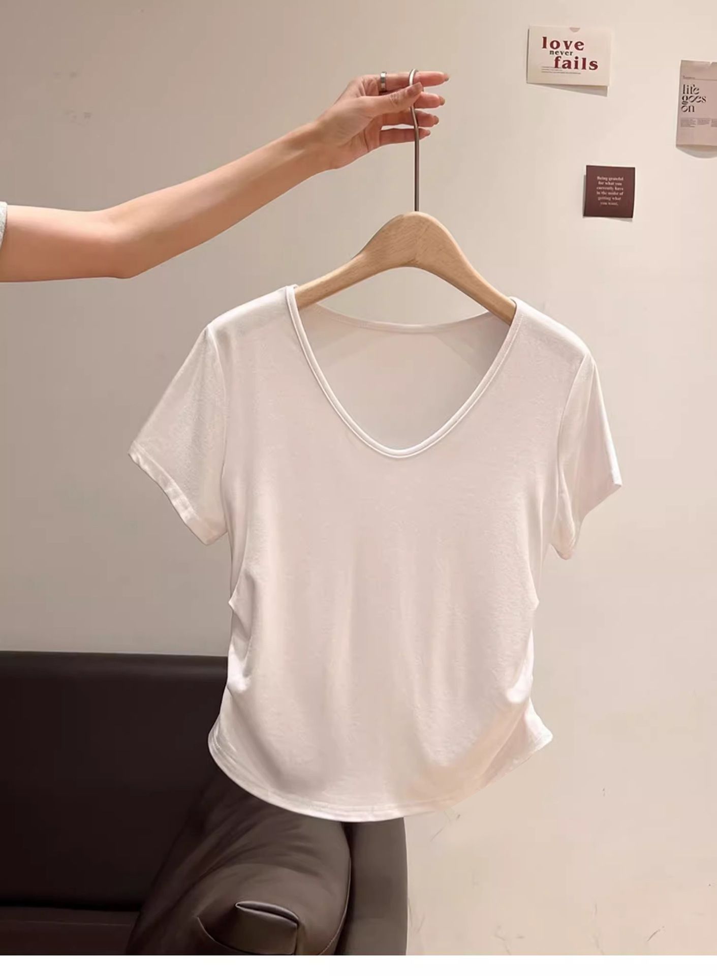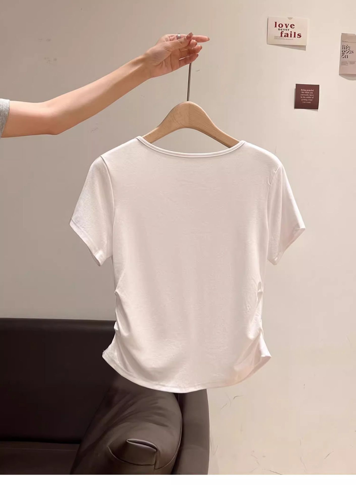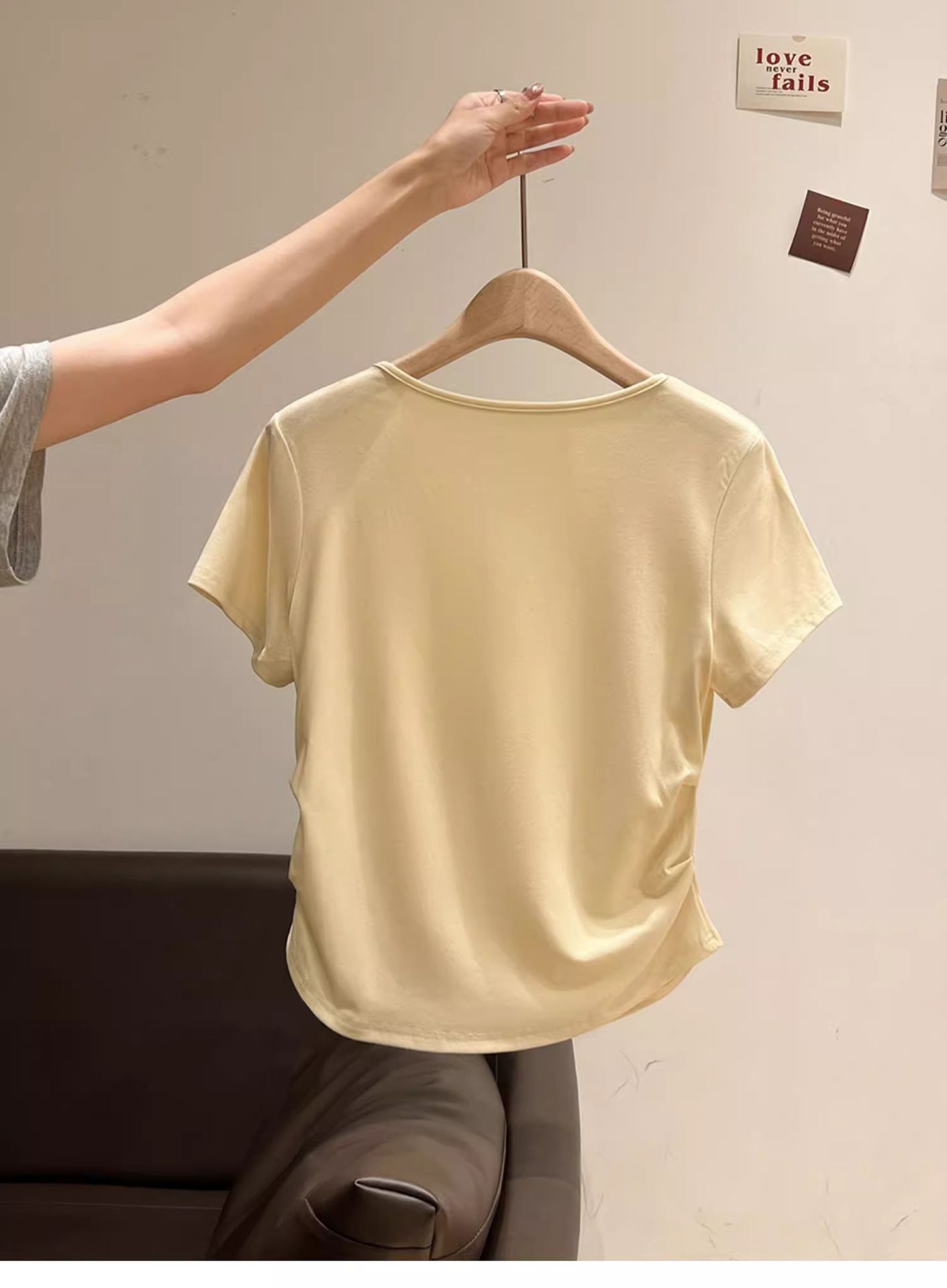 夏季短款褶皺收腰顯瘦高級V領T恤【買一送二】黑色+白色+黃色各一件(到手3件!每件均價333元!)