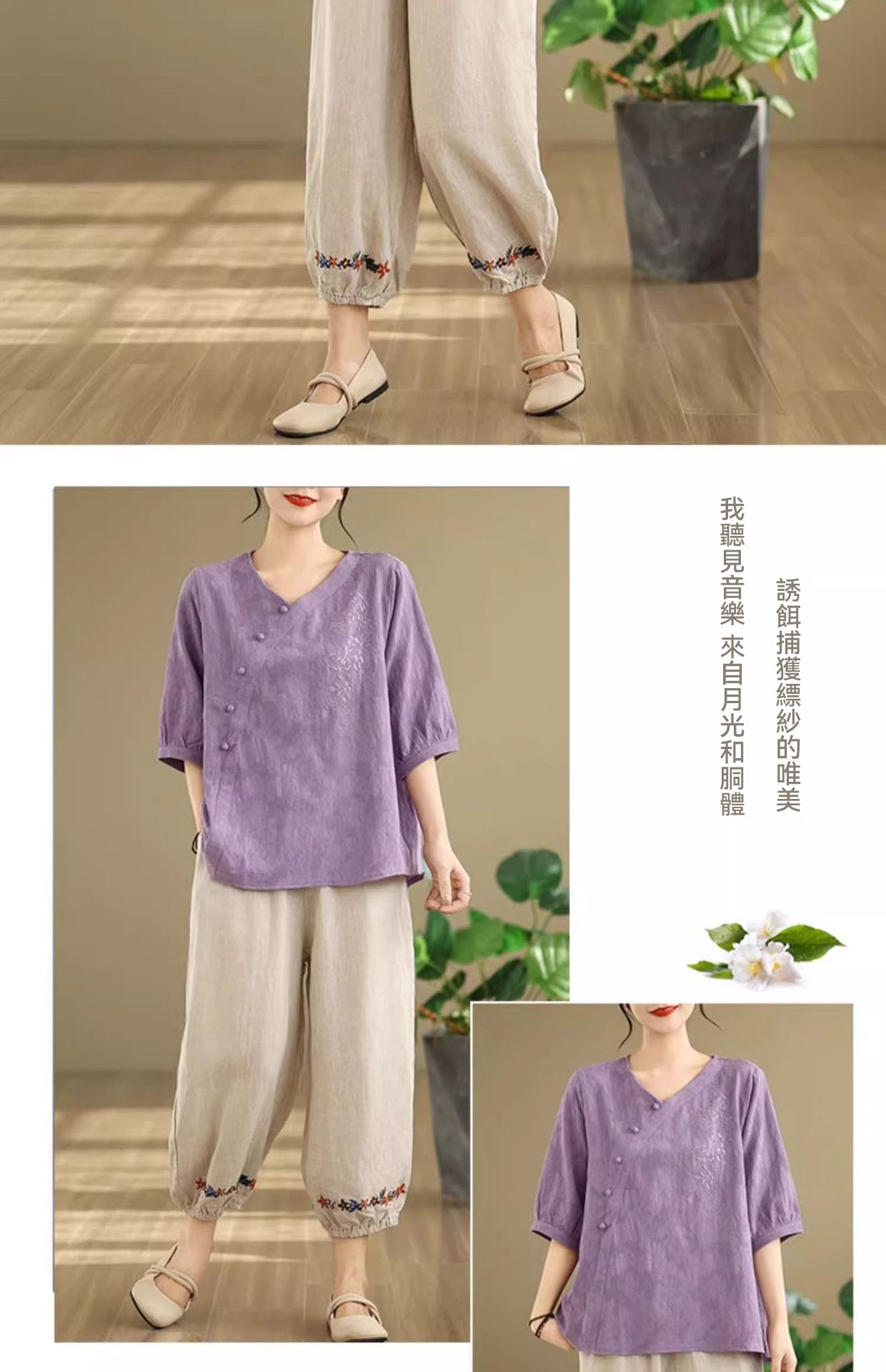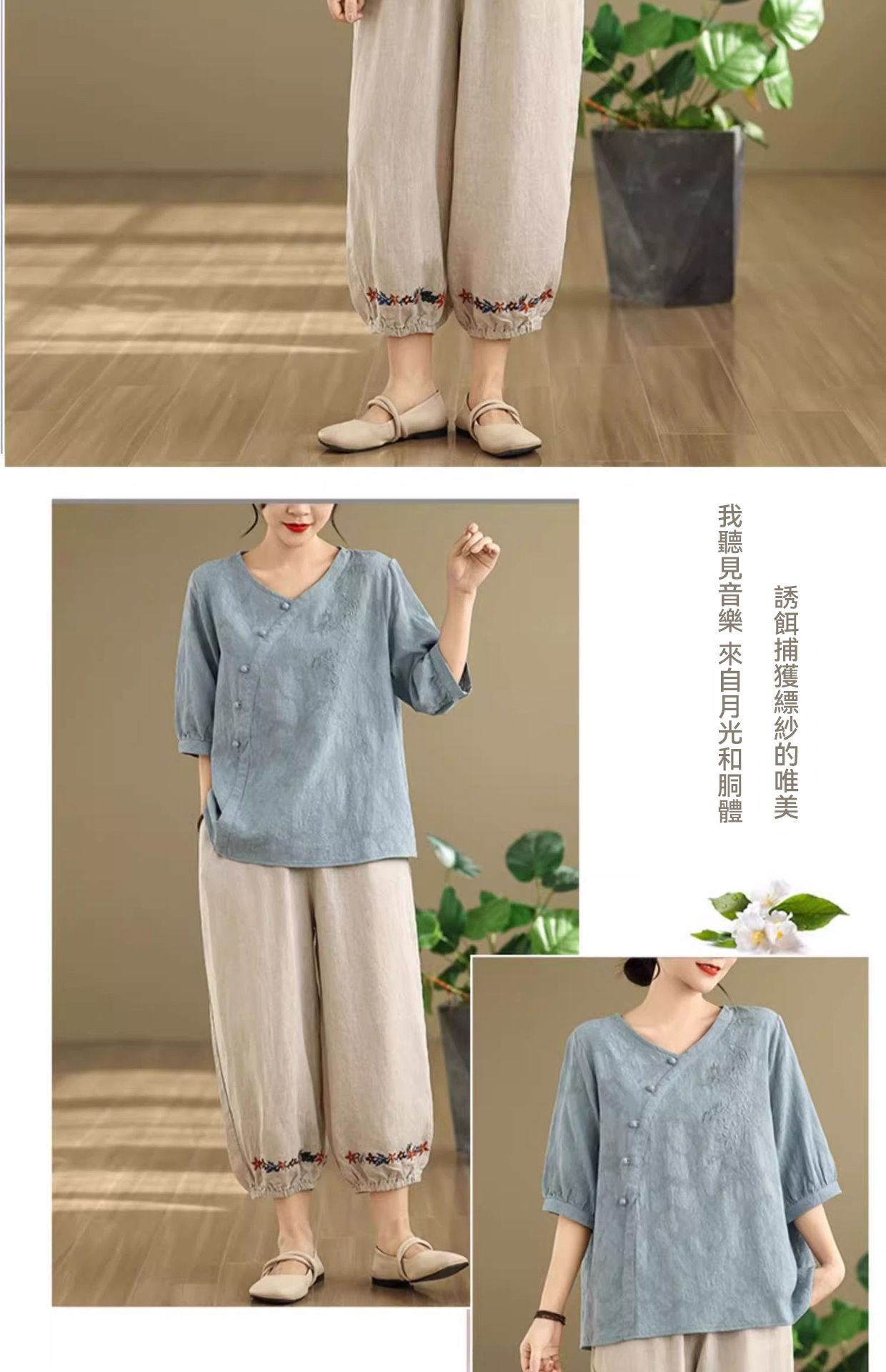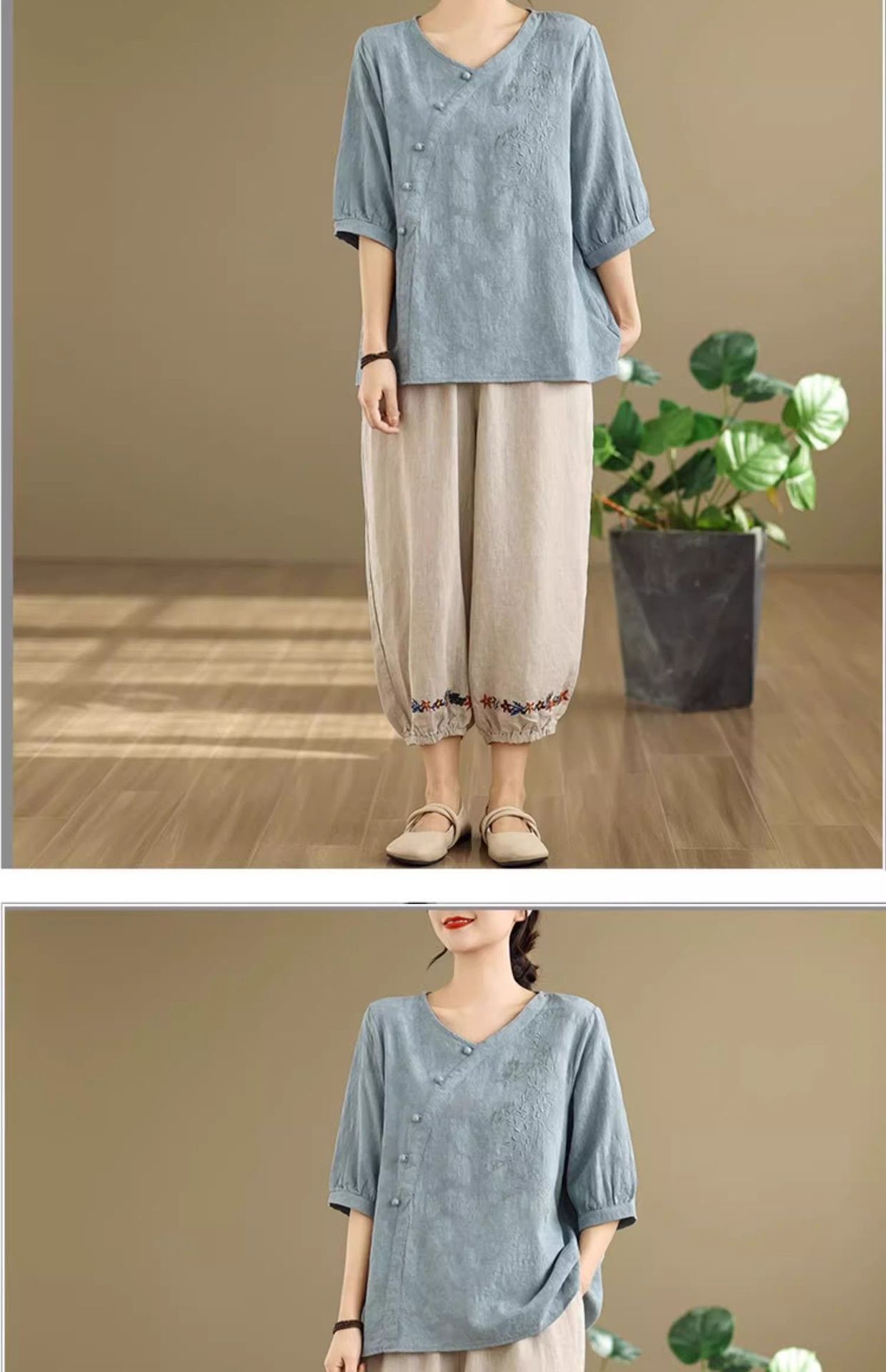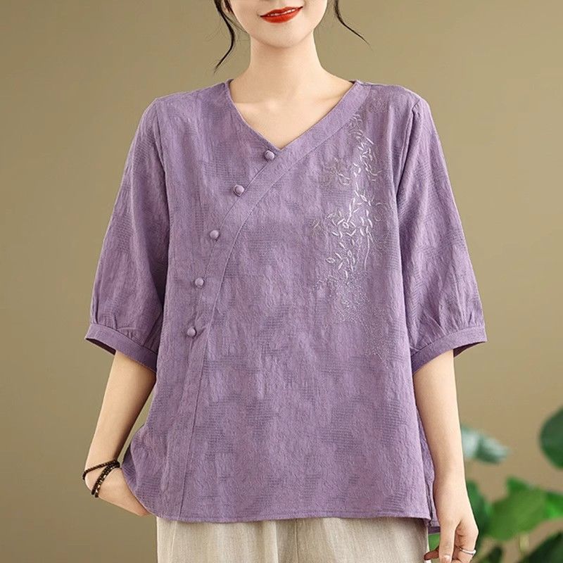 新中式媽媽棉麻刺繡上衣【買一送一】【藍色】+【紫色】各一件(到手兩件,每件均價649元)