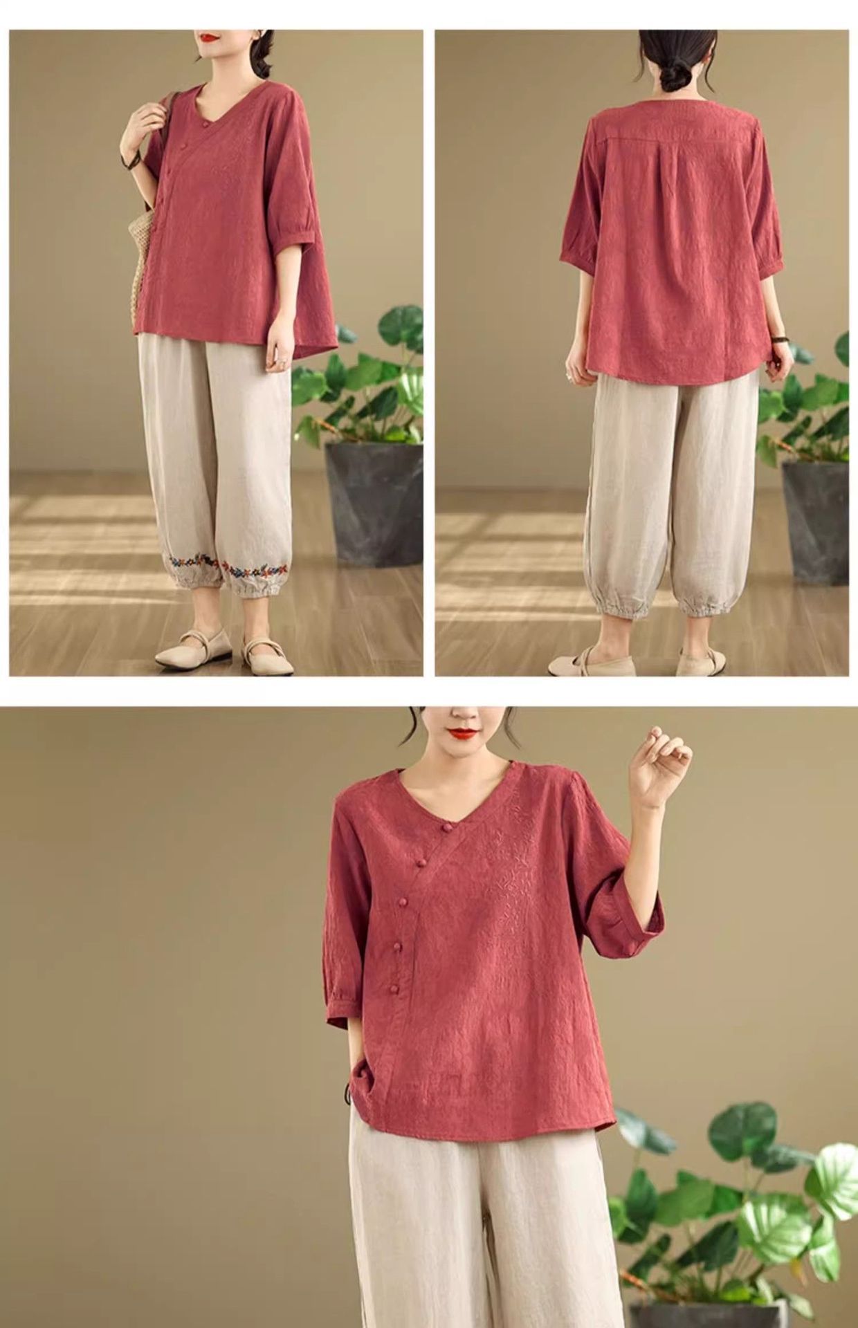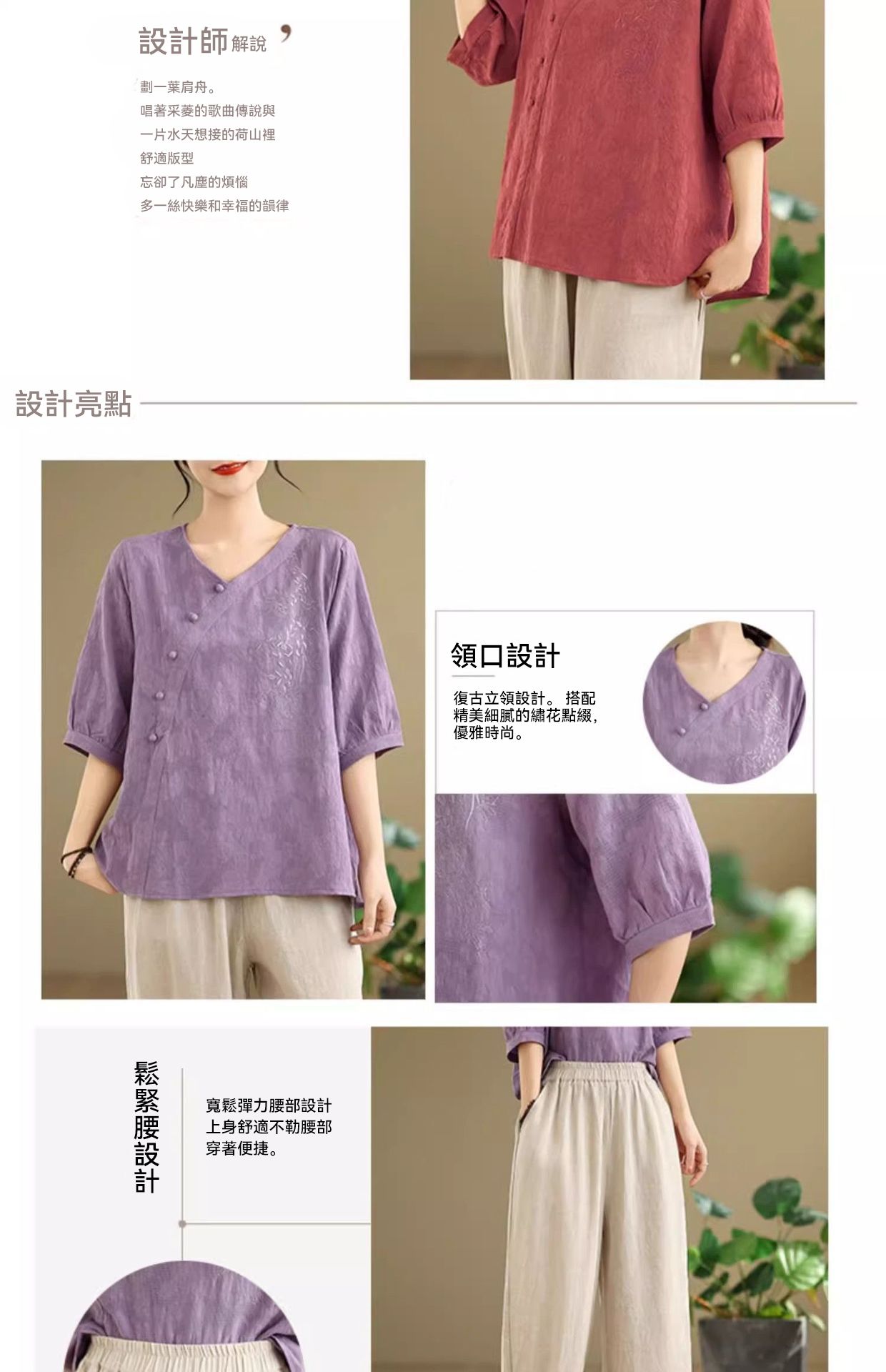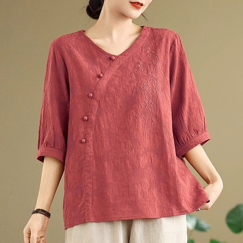 新中式媽媽棉麻刺繡上衣【買一送一】【紅色】+【紫色】各一件(到手兩件,每件均價649元)